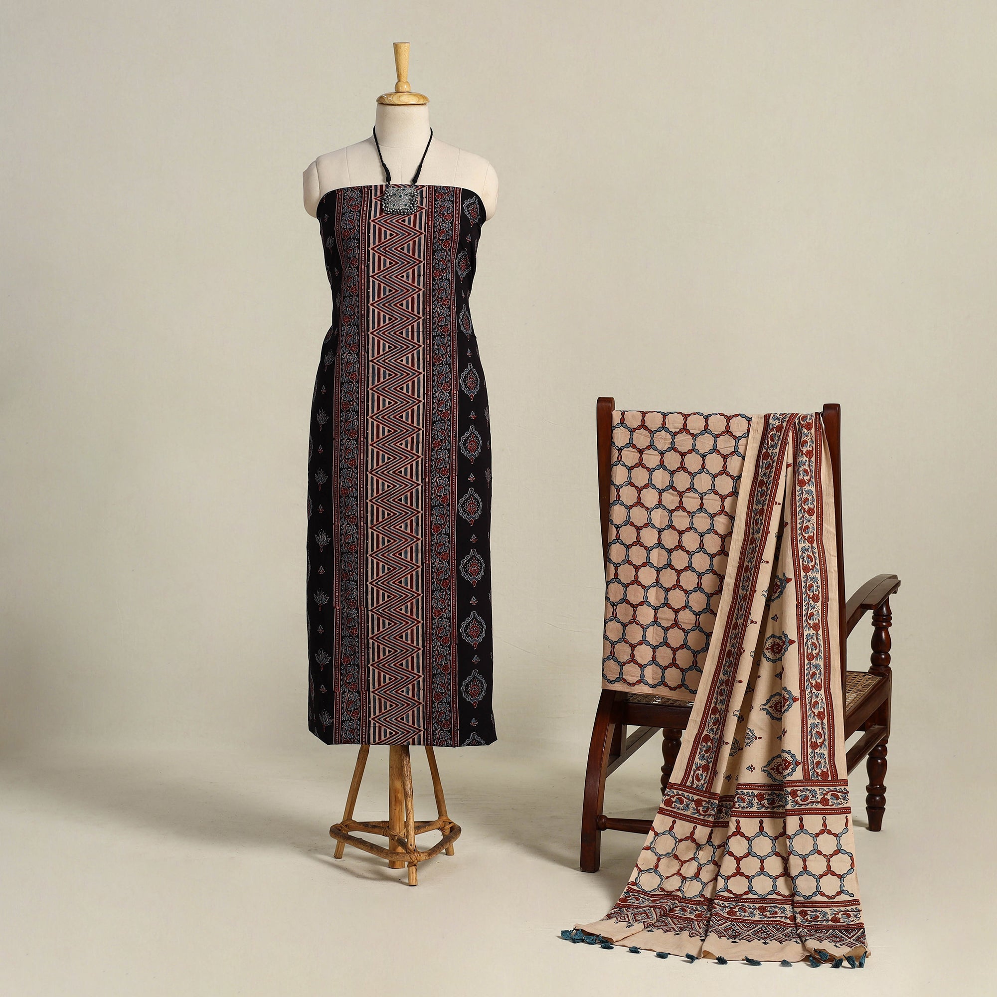 Elevate your wardrobe with this black hand-block printed cotton 3pc ajrakh dress material set, made with by artisans from Kutch, Gujarat. The ajrakh technique uses natural dyes, creating intricate patterns that reflect India’s rich textile heritage. this suit material is perfect for festive occasions or daily wear.