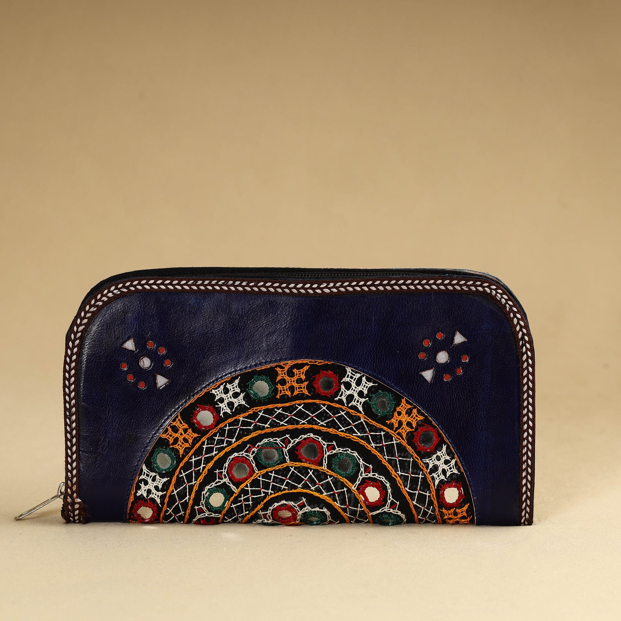 This handcrafted blue wallet, made with cruelty-free leather and cotton fabric, is adorned with Kutch mirror embroidery, bringing a touch of traditional to modern fashion. With two zipper pockets and a cotton fabric lining, this wallet provides ample space for all your essentials.