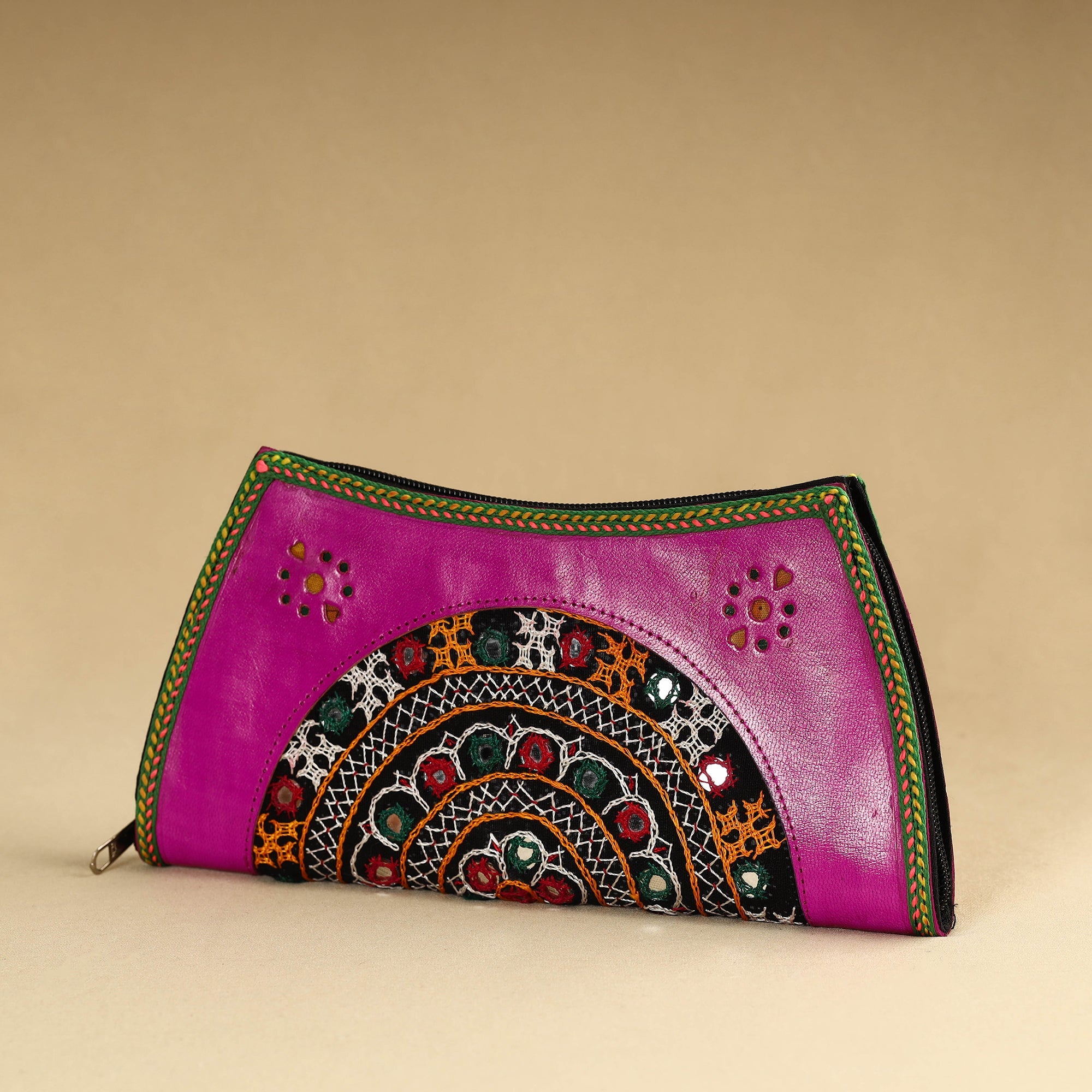 This handcrafted purple wallet, made with cruelty-free leather and cotton fabric, is adorned with Kutch mirror embroidery, bringing a touch of traditional to modern fashion. With two zipper pockets and a cotton fabric lining, this wallet provides ample space for all your essentials.