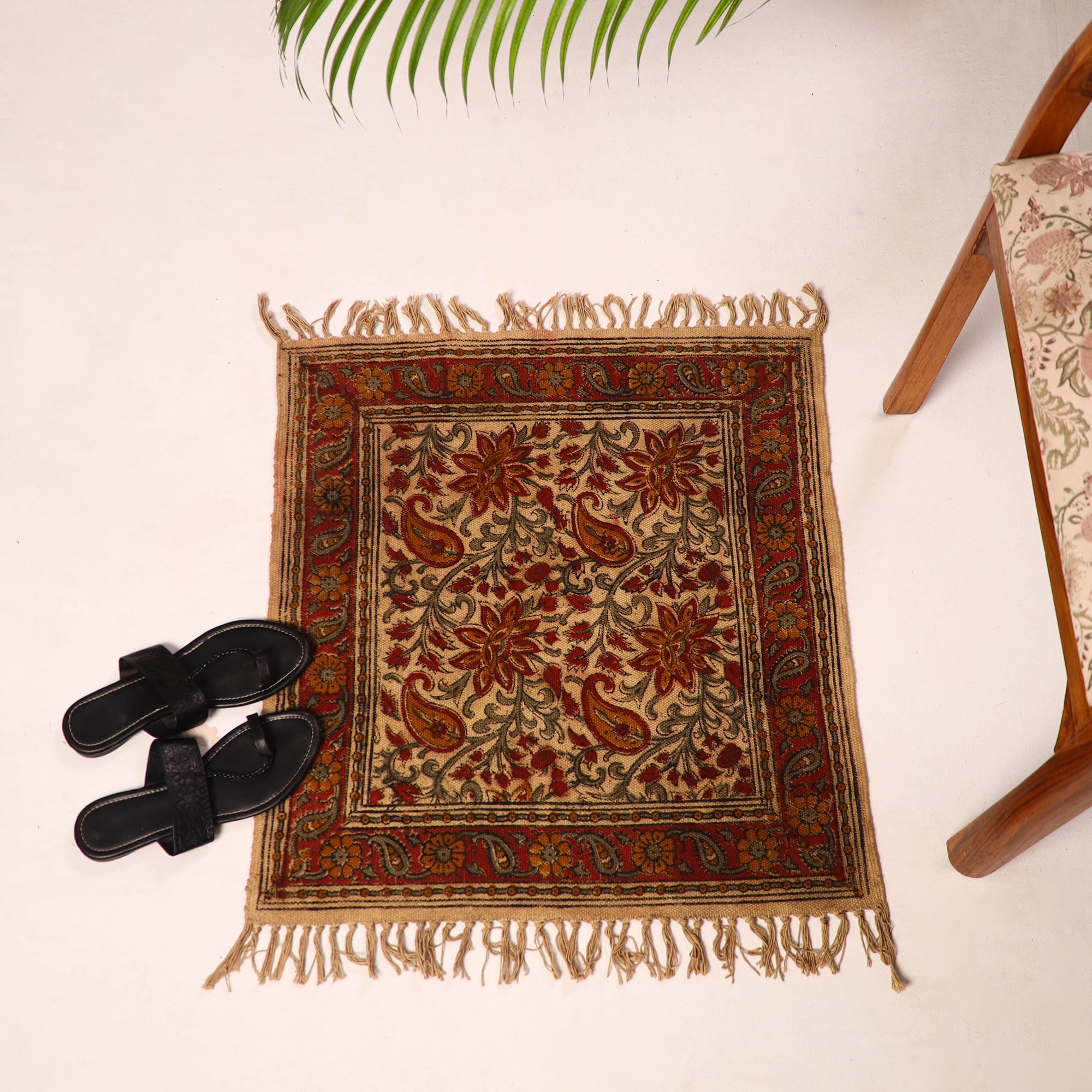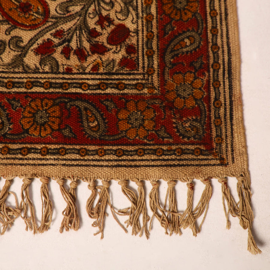 Add a touch of traditional elegance to your home with this kalamkari block printed cotton mat, showcasing motifs inspired by ancient Indian art. Made using the Warangal weave technique, each mat is block printed by skilled artisans, reflecting the intricate details of Kalamkari painting.