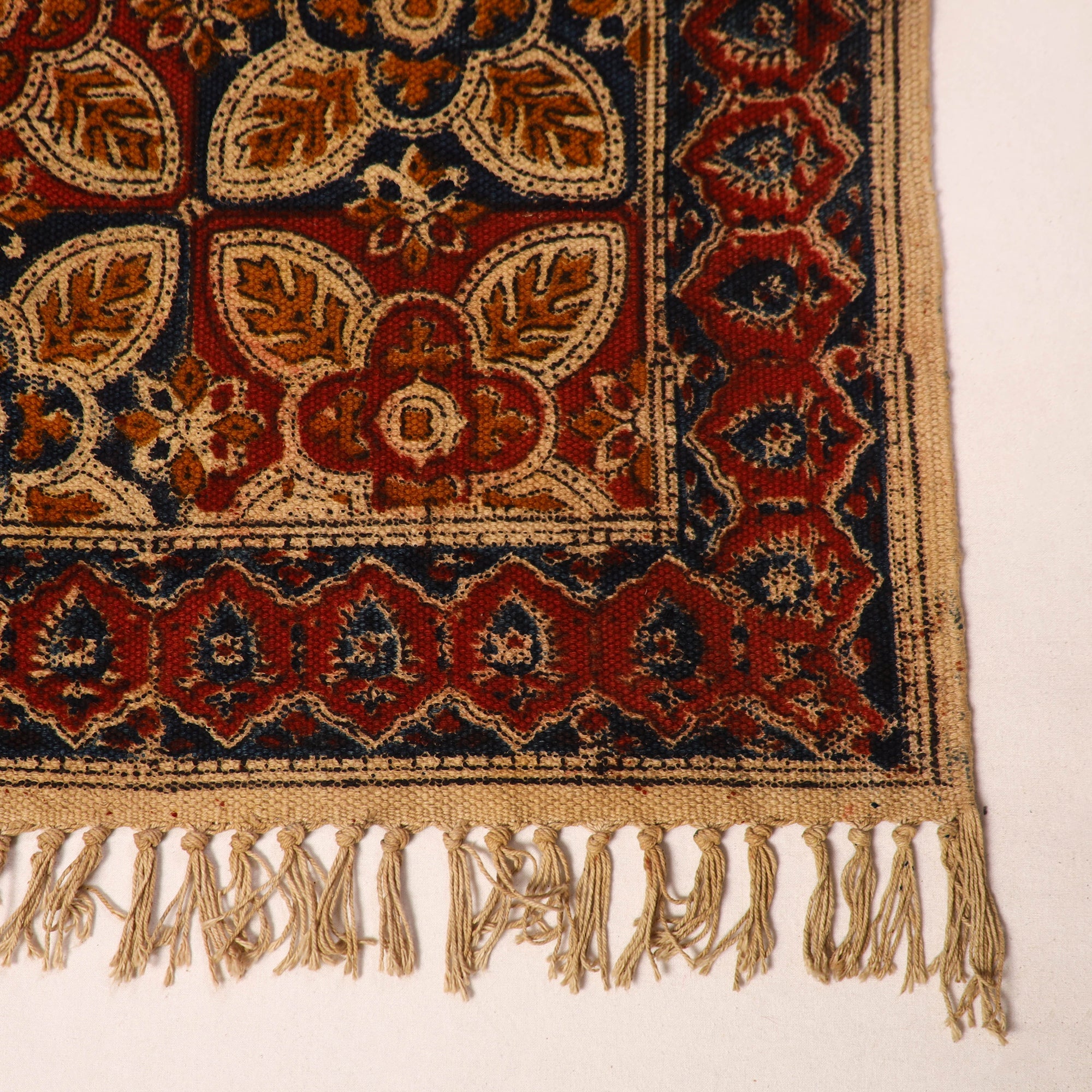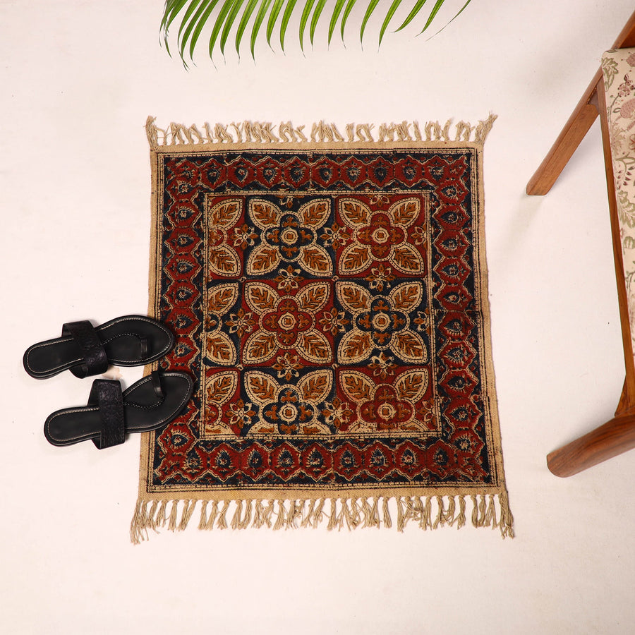 Add a touch of traditional elegance to your home with this kalamkari block printed cotton mat, showcasing motifs inspired by ancient Indian art. Made using the Warangal weave technique, each mat is block printed by skilled artisans, reflecting the intricate details of Kalamkari painting.