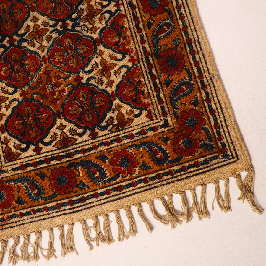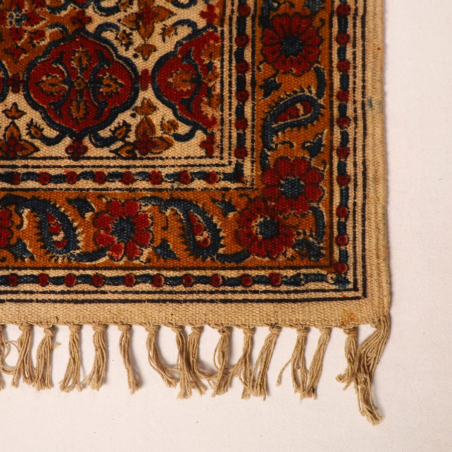 Add a touch of traditional elegance to your home with this kalamkari block printed cotton mat, showcasing motifs inspired by ancient Indian art. Made using the Warangal weave technique, each mat is block printed by skilled artisans, reflecting the intricate details of Kalamkari painting.