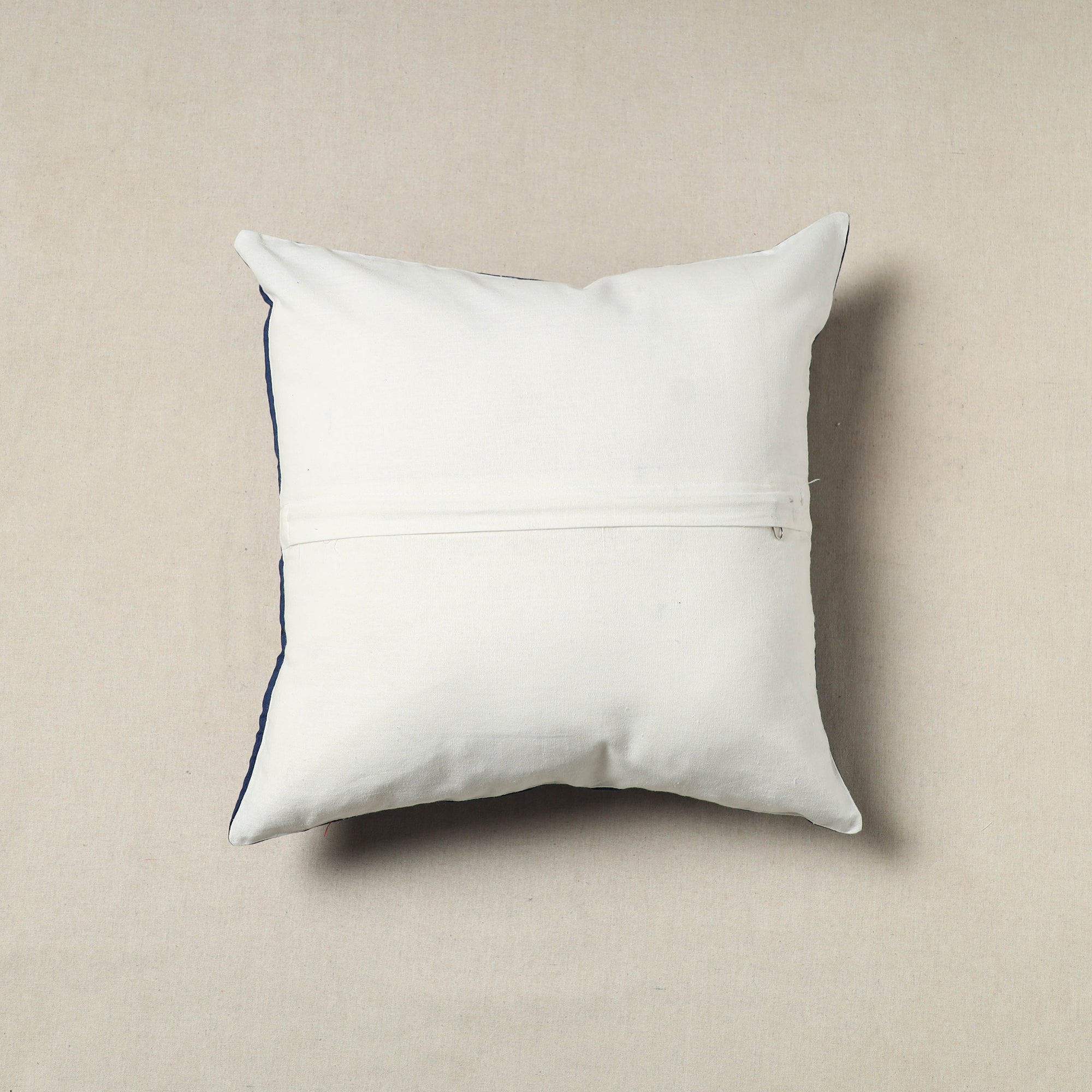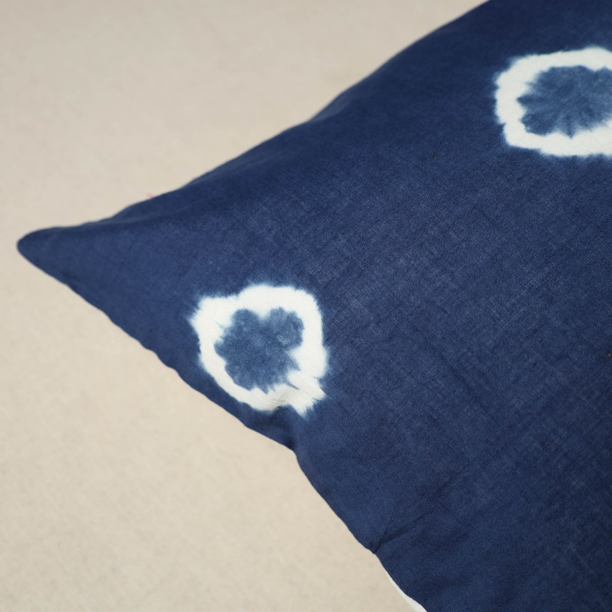 Enhance your home with the charm of this blue handcrafted shibori cushion cover. Care for your piece by hand washing in cold water. Created using the traditional shibori technique, where fabric is intricately tied and dyed, each cover reflects a unique pattern.