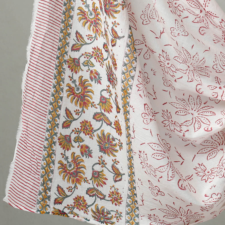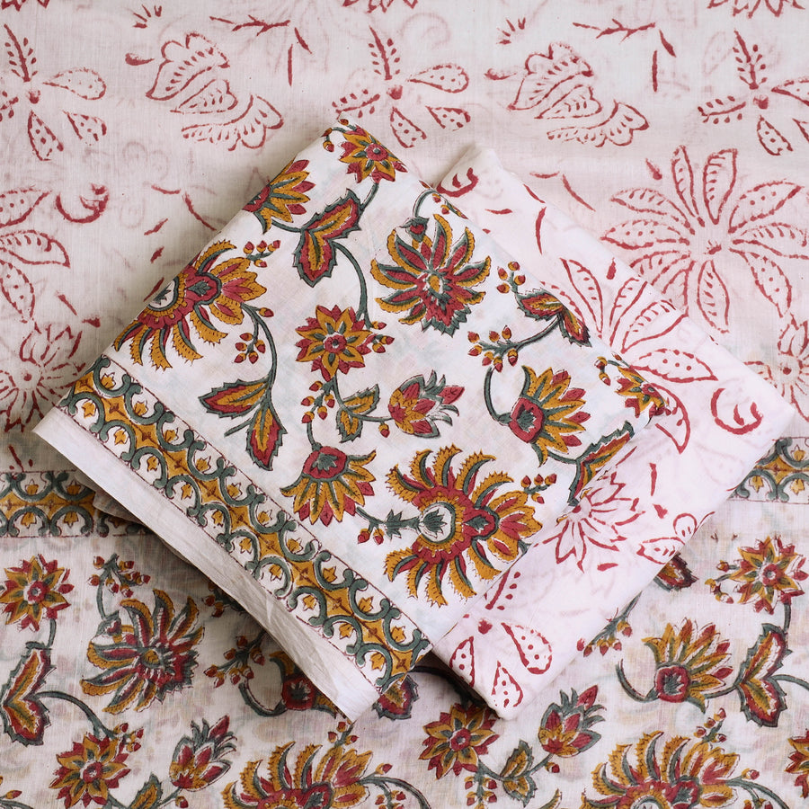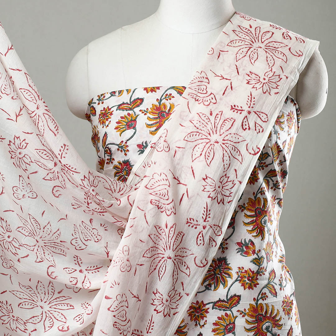 Elevate your ethnic wardrobe with this 3pc cotton sanganeri print dress material set from Jaipur, Rajasthan. Sanganeri block printing is renowned for its intricate floral and paisley designs. Made using eco-friendly, bleed-free VAT dyes used in this dress material ensure long-lasting colour vibrancy.