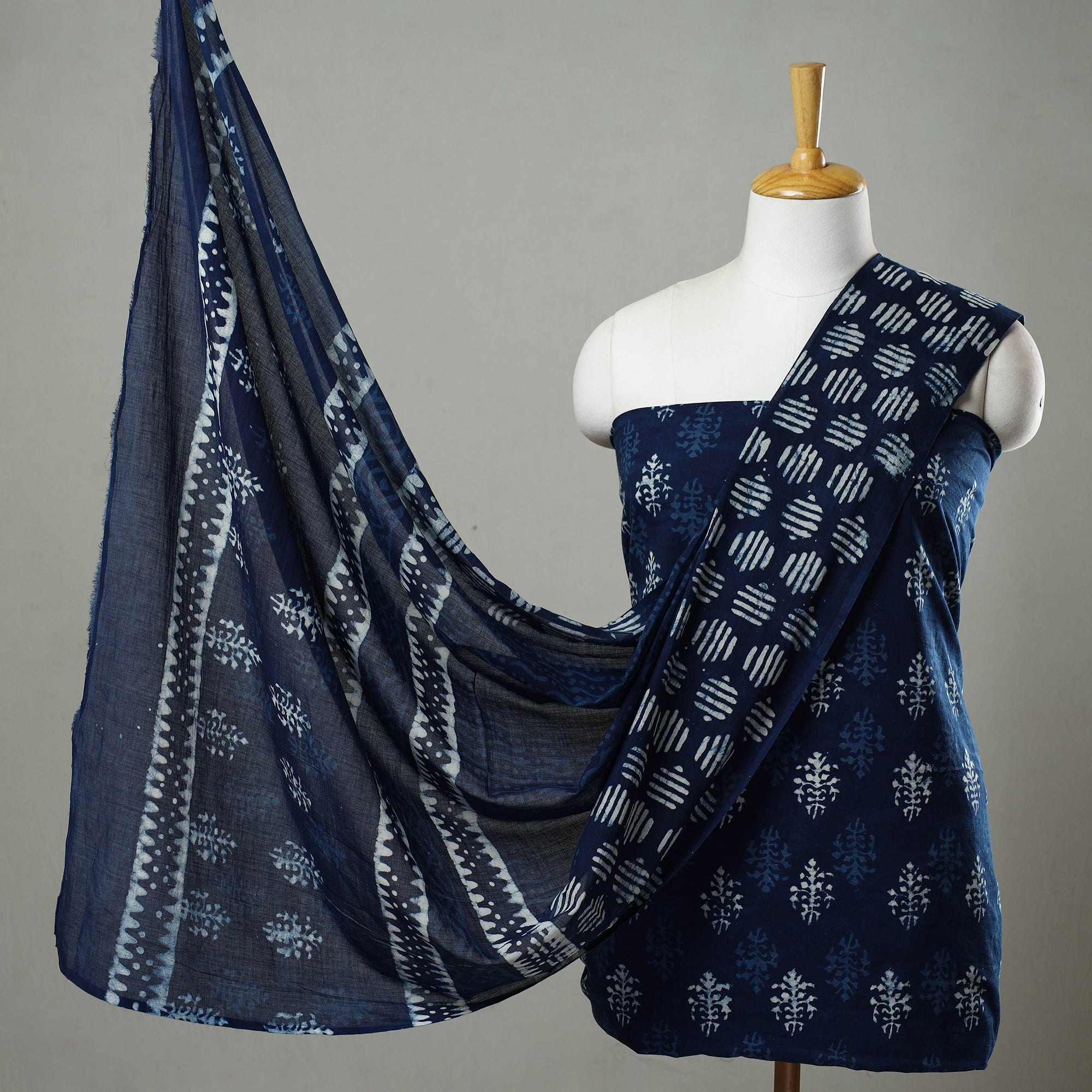 Immerse yourself in the heritage of rajasthan with this indigo cotton bagru dress material set. This set features intricate hand-block prints made using natural dyes and a traditional mud-resist process. Paired with a cotton dupatta, it’s a perfect choice for those who value craftsmanship and heritage.