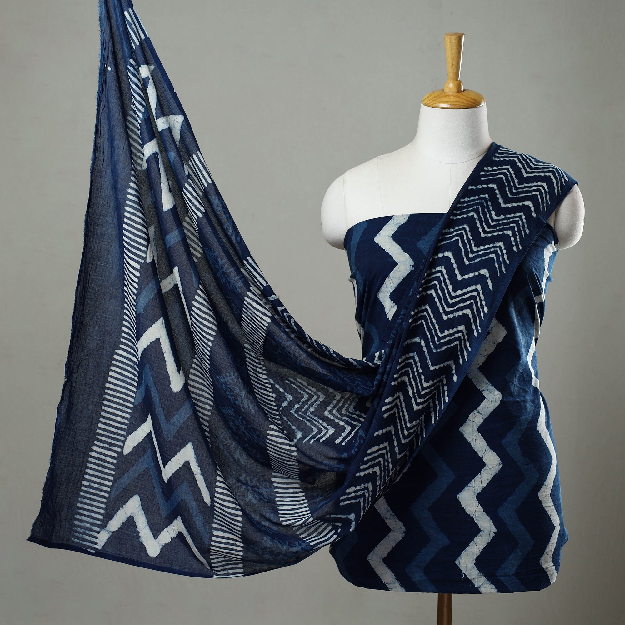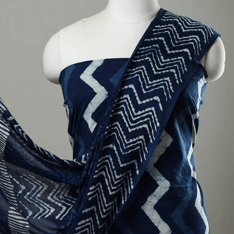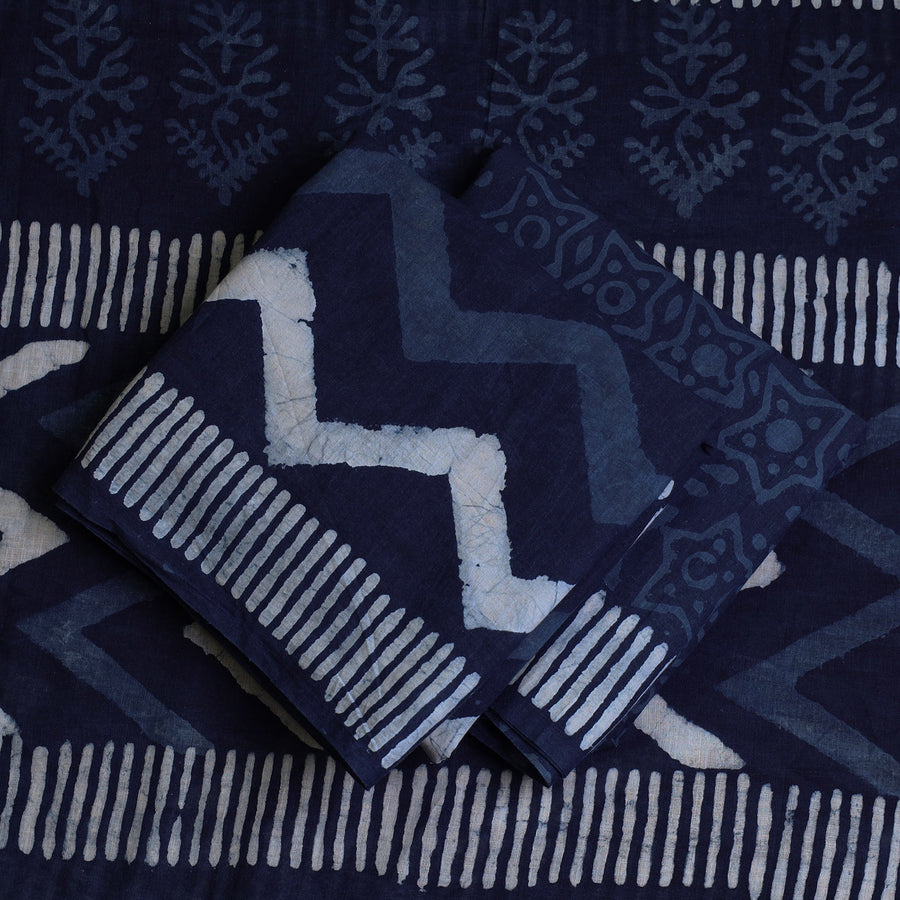 Immerse yourself in the heritage of rajasthan with this indigo cotton bagru dress material set. This set features intricate hand-block prints made using natural dyes and a traditional mud-resist process. Paired with a cotton dupatta, it’s a perfect choice for those who value craftsmanship and heritage.