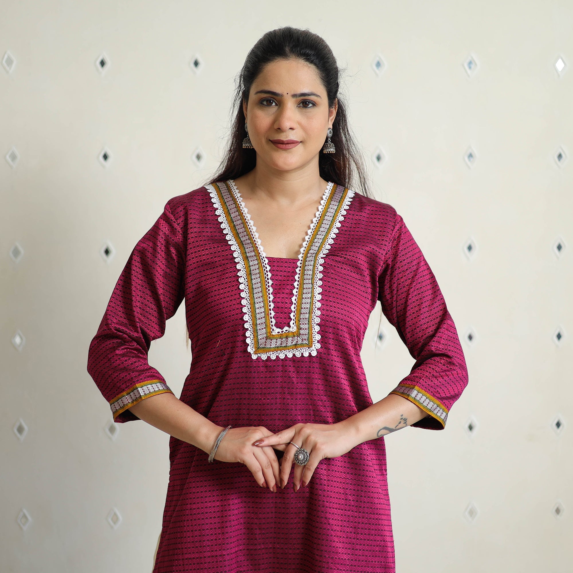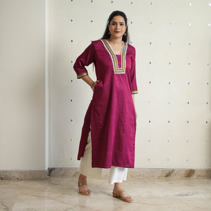 Experience timeless elegance with our lace work khun straight kurta. Crafted from khun cotton fabric, this kurta boasts a unique texture and bright glow, reflecting the rich heritage of traditional Indian textiles. The addition of a handy one-side pocket adds practicality to its chic design. Ideal for both casual and festive occasions, this kurta offers comfort and style.