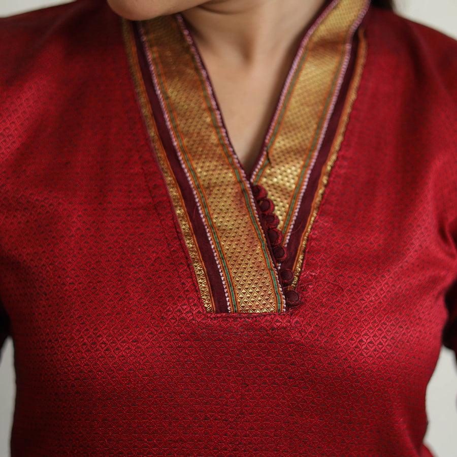 Khun is woven exclusively on a loom in Guledagudd, Bagalkot region, Karnataka. Used only for sari blouses, this handmade fabric is easily recognizable by its small white intricate motif and distinctive reddish-purple border.