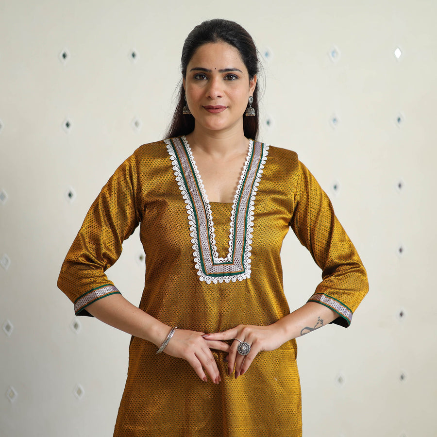 Experience timeless elegance with our lace work khun straight kurta. Crafted from khun cotton fabric, this kurta boasts a unique texture and bright glow, reflecting the rich heritage of traditional Indian textiles. The addition of a handy one-side pocket adds practicality to its chic design. Ideal for both casual and festive occasions, this kurta offers comfort and style.
