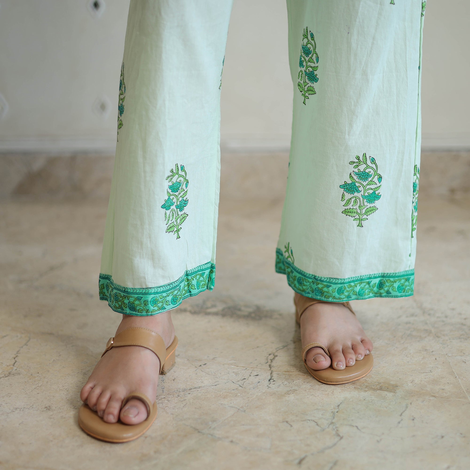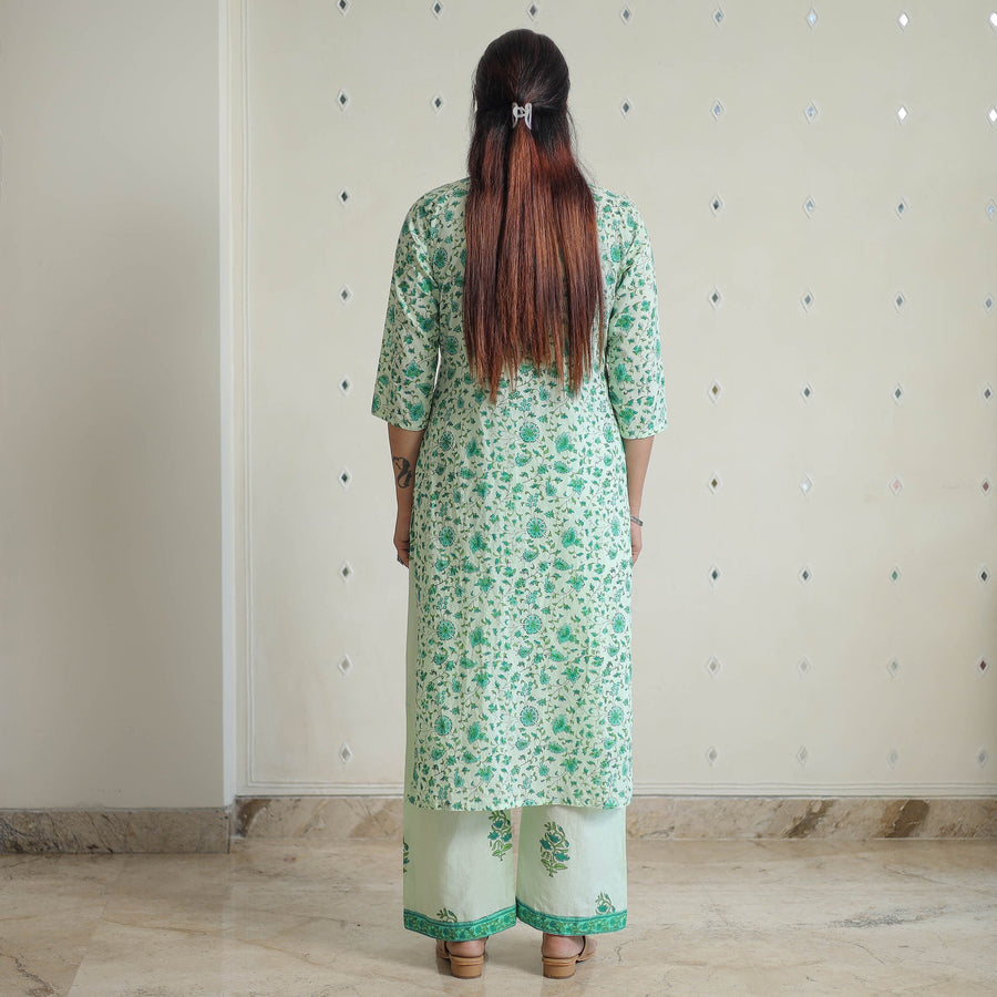 Step out in style with this sanganeri block-printed cotton suit set. The set includes a comfortable kurta with a side pocket, stylish palazzo with two pockets, and a chanderi silk dupatta. The sanganeri craft, originating from Rajasthan, is celebrated for its intricate designs and vibrant patterns. This suit set is perfect for daily outings and special occasions alike.