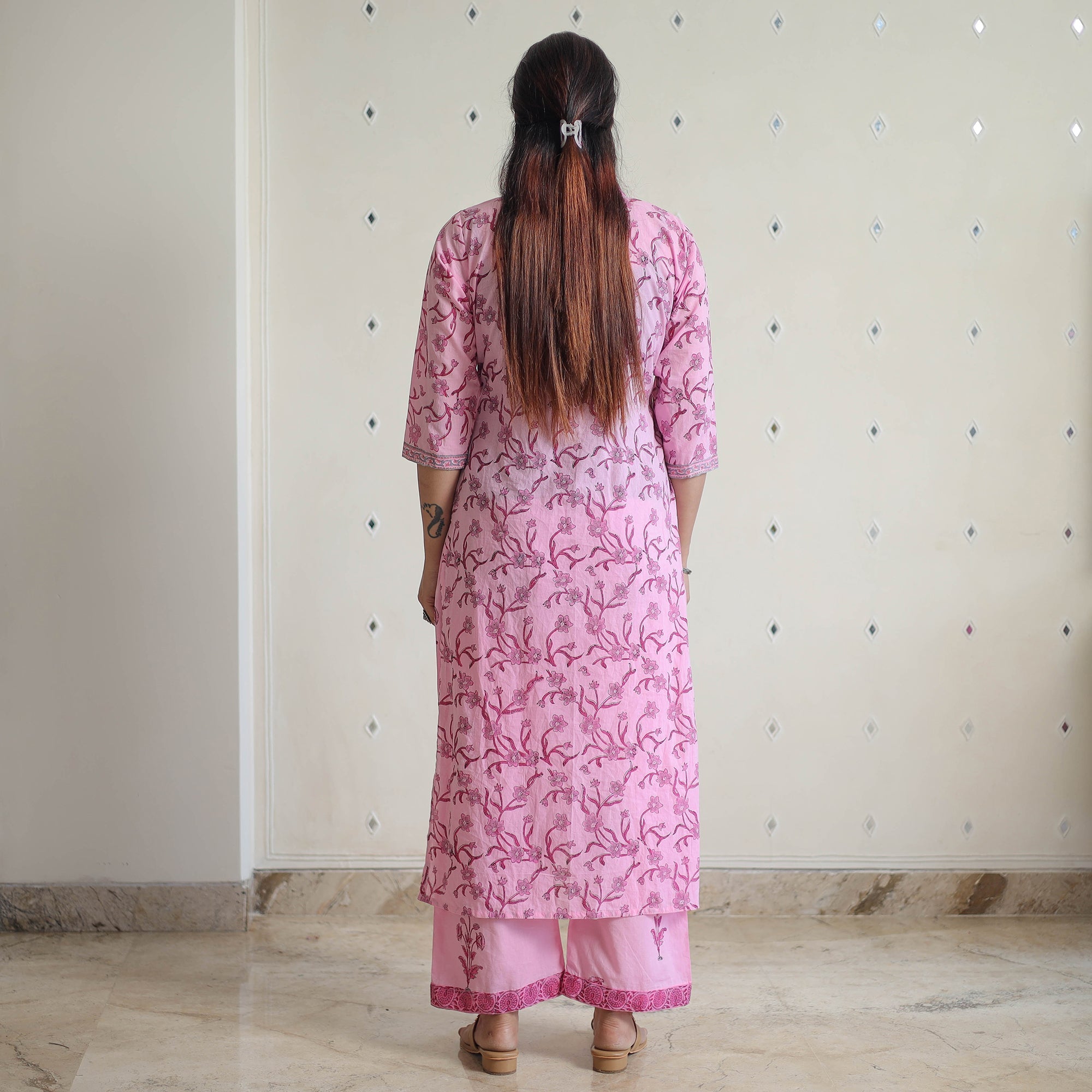 Step out in style with this sanganeri block-printed cotton suit set. The set includes a comfortable kurta with a side pocket, stylish palazzo with two pockets, and a chanderi silk dupatta. The sanganeri craft, originating from Rajasthan, is celebrated for its intricate designs and vibrant patterns. This suit set is perfect for daily outings and special occasions alike.