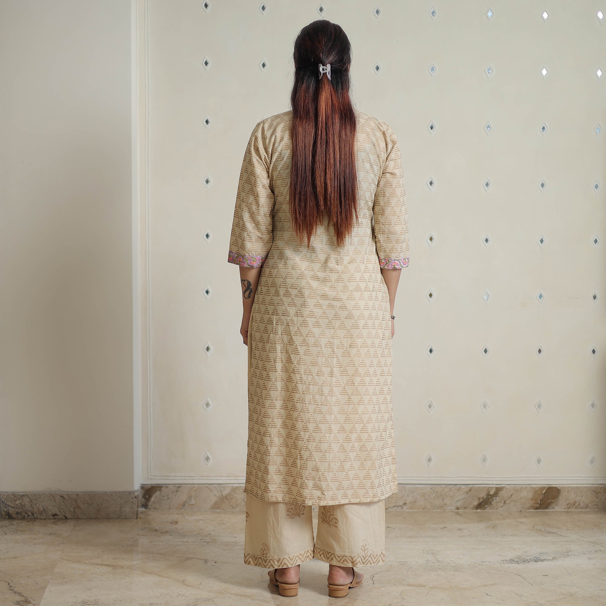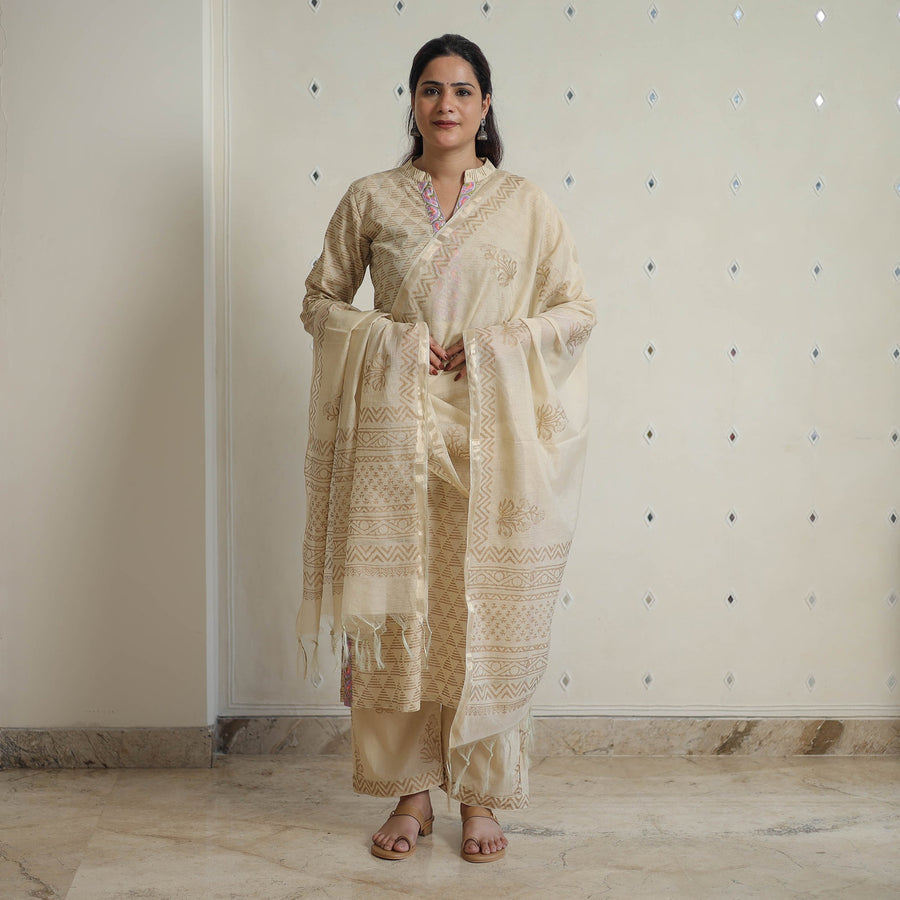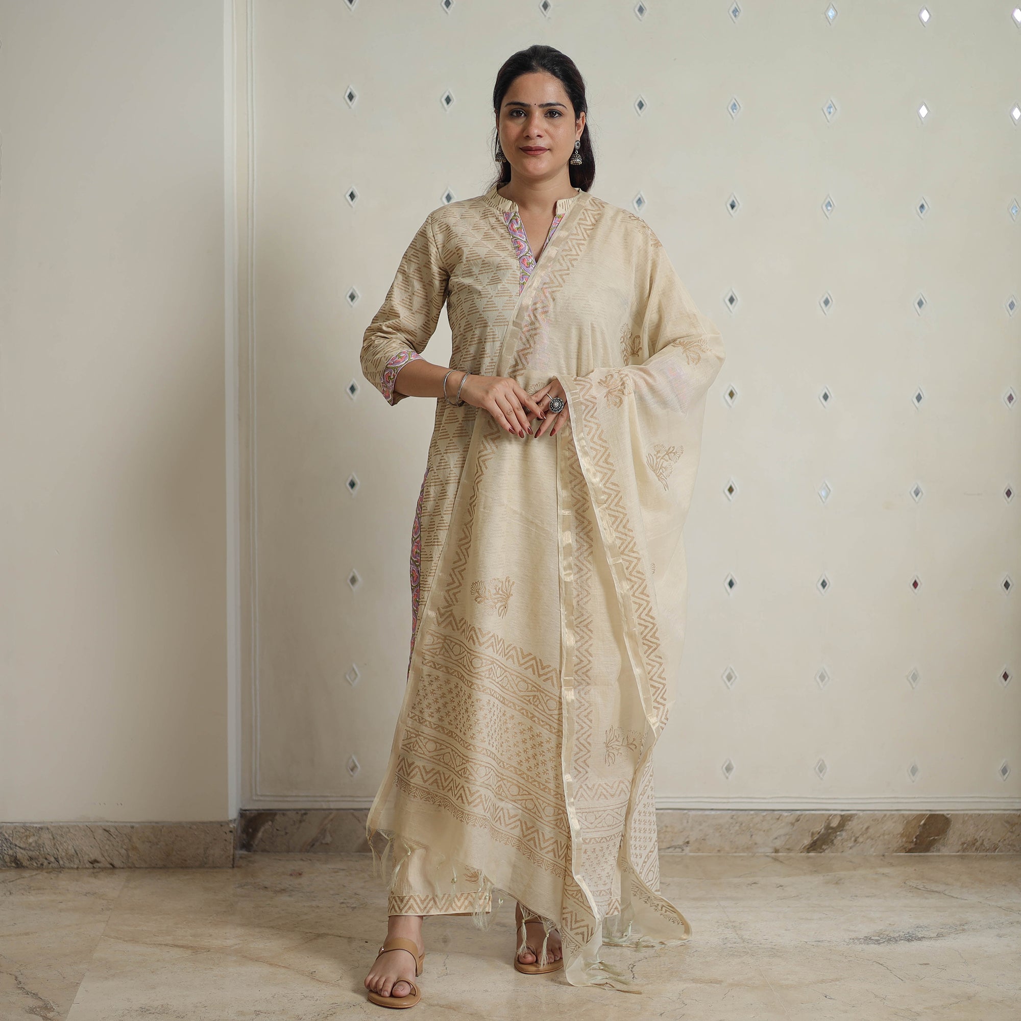 Step out in style with this sanganeri block-printed cotton suit set. The set includes a comfortable kurta with a side pocket, stylish palazzo with two pockets, and a chanderi silk dupatta. The sanganeri craft, originating from Rajasthan, is celebrated for its intricate designs and vibrant patterns. This suit set is perfect for daily outings and special occasions alike.
