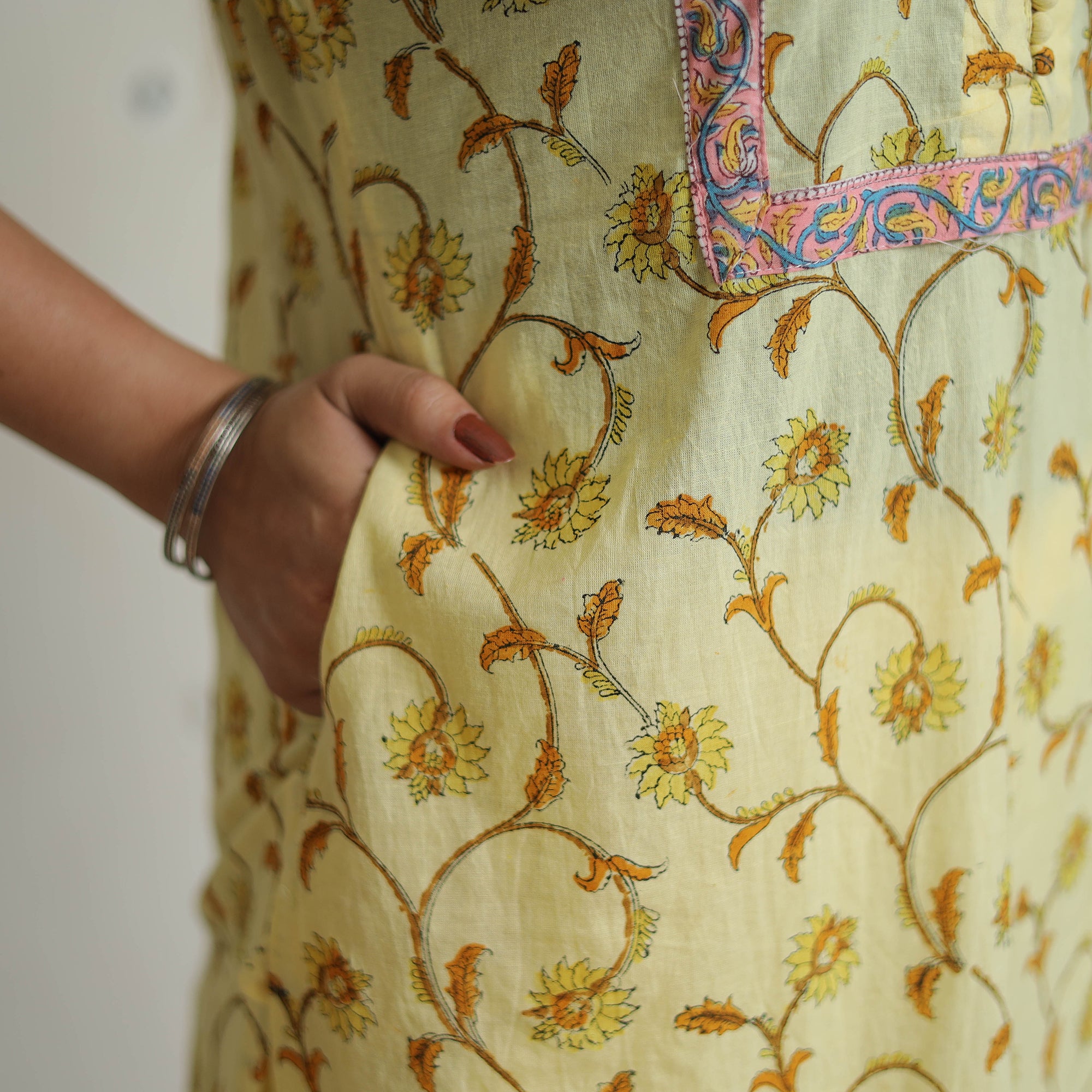Step out in style with this sanganeri block-printed cotton suit set. The set includes a comfortable kurta with a side pocket, stylish palazzo with two pockets, and a chanderi silk dupatta. The sanganeri craft, originating from Rajasthan, is celebrated for its intricate designs and vibrant patterns. This suit set is perfect for daily outings and special occasions alike.
