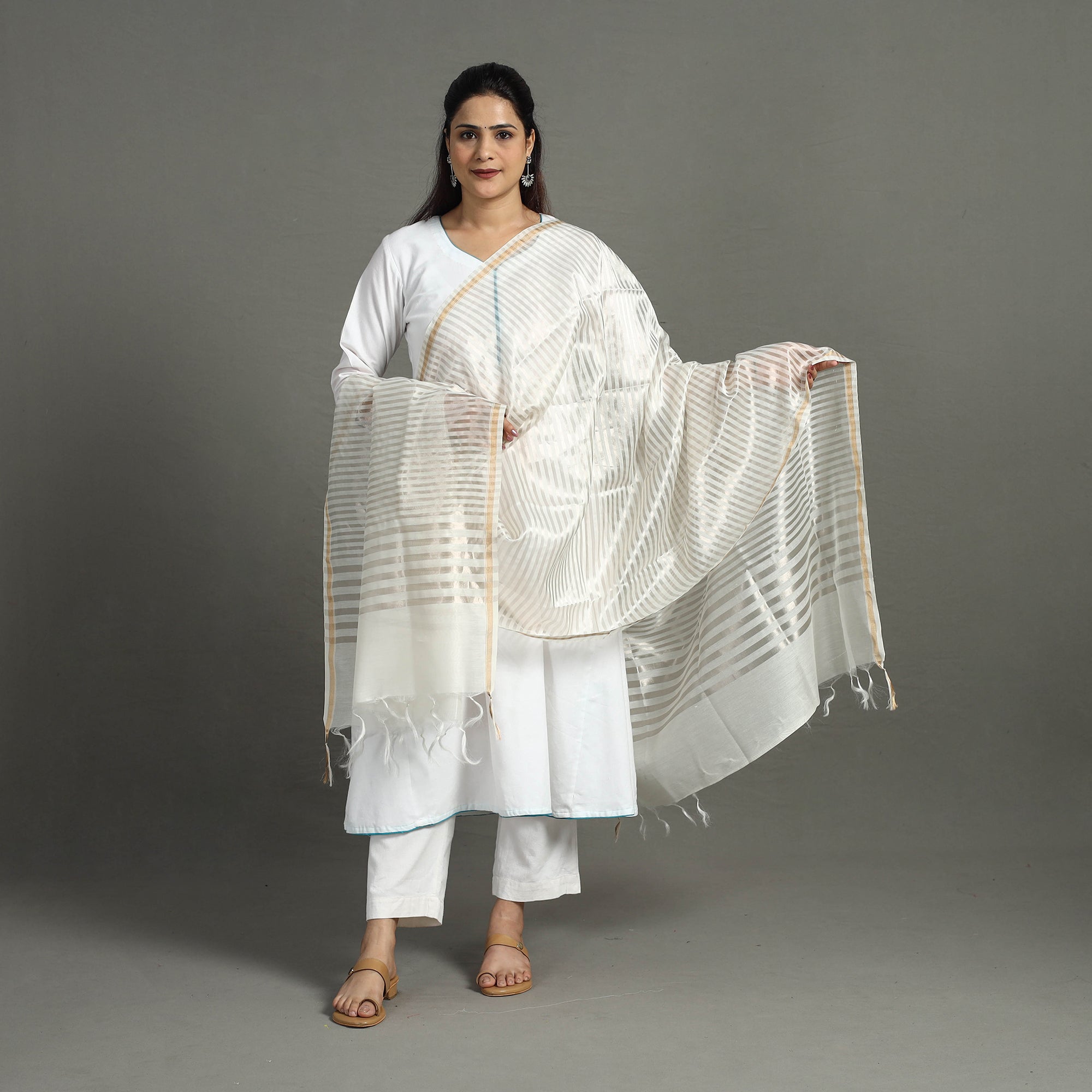 This beautiful silk-cotton chanderi dupatta is a of traditional from the historic town of chanderi. handwoven by master artisan Rauph Khan, it features intricate zari stripe and fine silk-cotton texture that lends a graceful, gossamer feel. chanderi weaving is renowned for its delicate motifs created with separate needles, a technique passed down through generations.