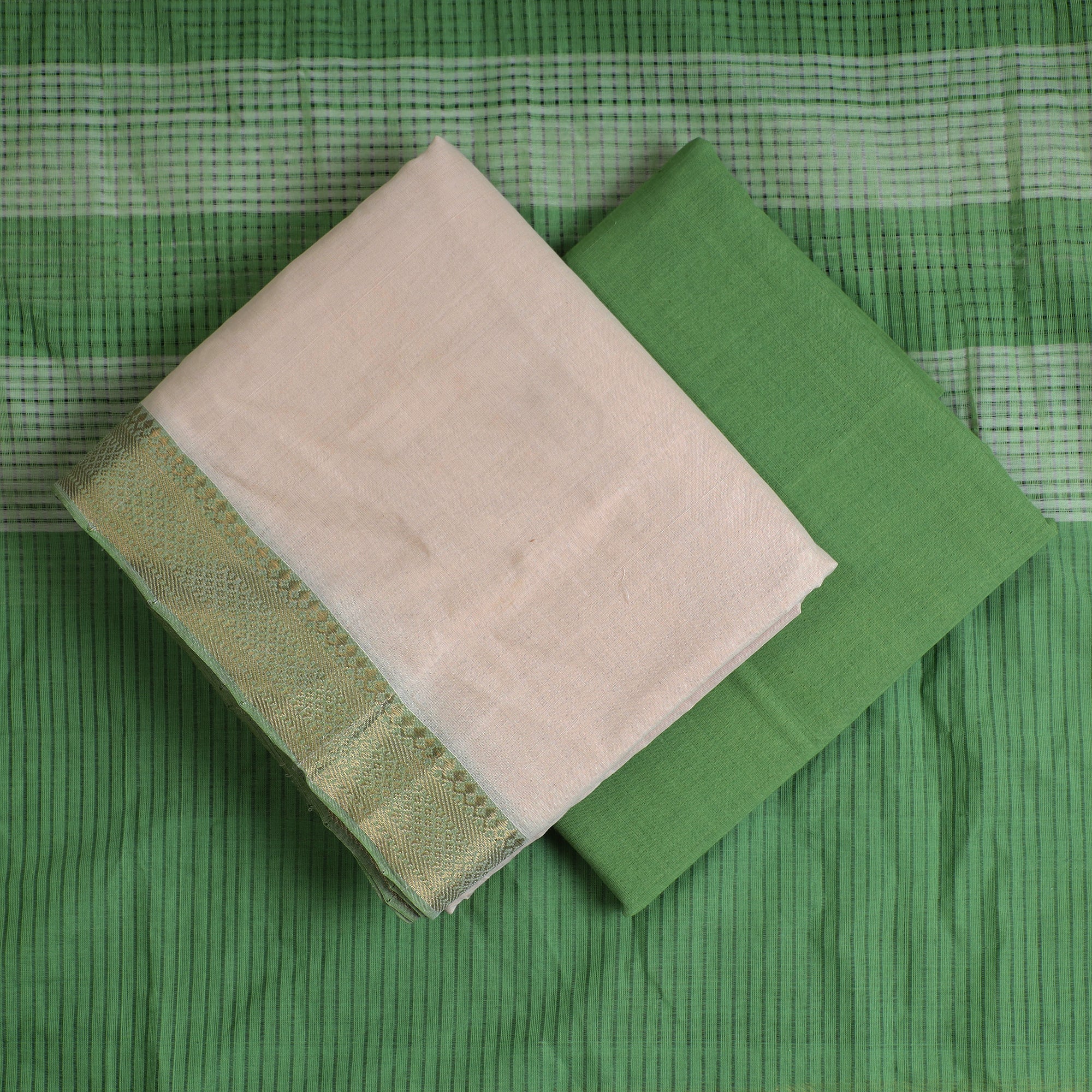 Elevate your ethnic wardrobe with a fine-quality 3pc mangalagiri handloom cotton nizam zari border suit material set with a missing check dupatta from Andhra Pradesh. This suit material is made from handloom cotton, known for its softness and durability. The set comes with a matching plain bottom/salwar piece, allowing you to customize your outfit. The zari border on the kurta and dupatta adds a touch of elegance and sophistication.