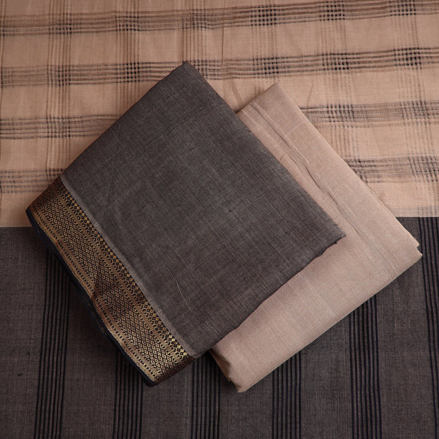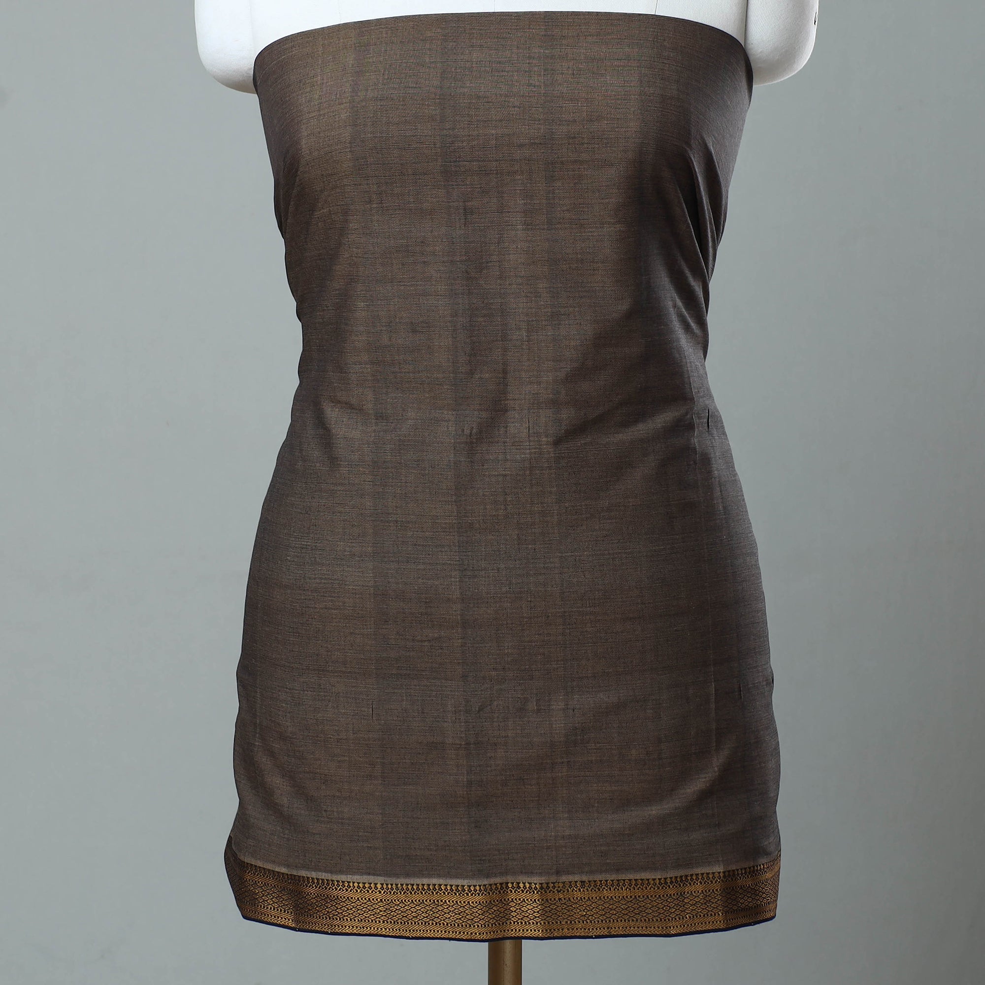 Elevate your ethnic wardrobe with a fine-quality brown 3pc mangalagiri handloom cotton nizam zari border suit material set with a missing check dupatta from Andhra Pradesh. This suit material is made from handloom cotton, known for its softness and durability. The set comes with a matching plain bottom/salwar piece, allowing you to customize your outfit. The zari border on the kurta and dupatta adds a touch of elegance and sophistication.