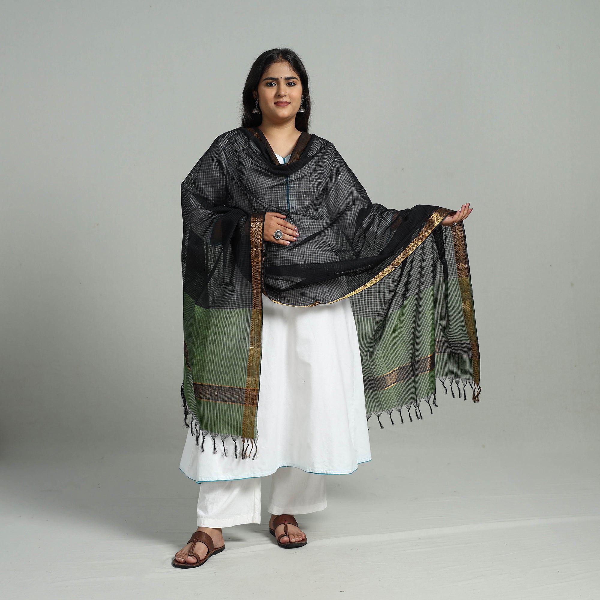 Elevate your ethnic wear with this missing checks cotton handloom mangalagiri dupatta, meticulously crafted by artisans from Guntur, Andhra Pradesh. The luxurious nizam zari border and delicate tassels add a touch of elegance, making it perfect to pair with salwar kameez, lehenga choli, or sarees.