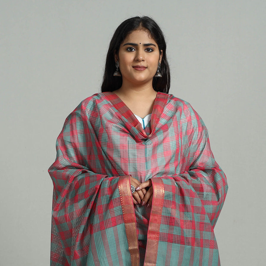 Elevate your ethnic wear with this missing checks cotton handloom mangalagiri dupatta, meticulously crafted by artisans from Guntur, Andhra Pradesh. The luxurious nizam zari border and delicate tassels add a touch of elegance, making it perfect to pair with salwar kameez, lehenga choli, or sarees.