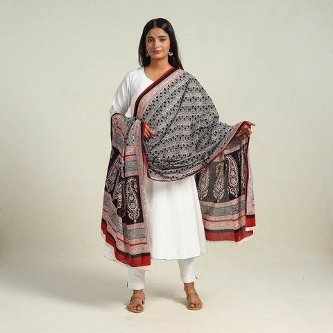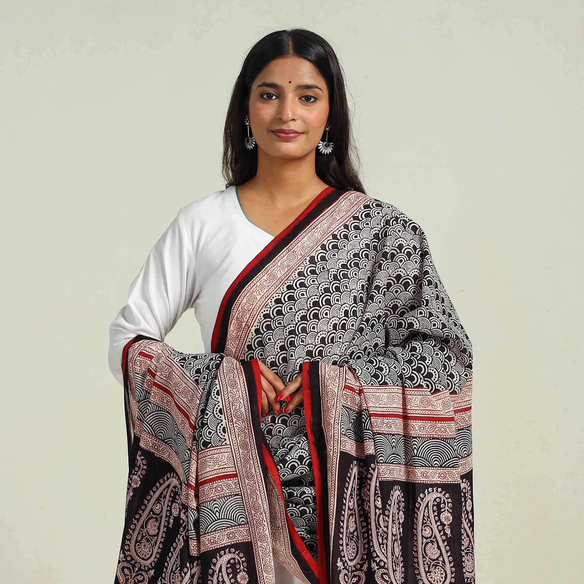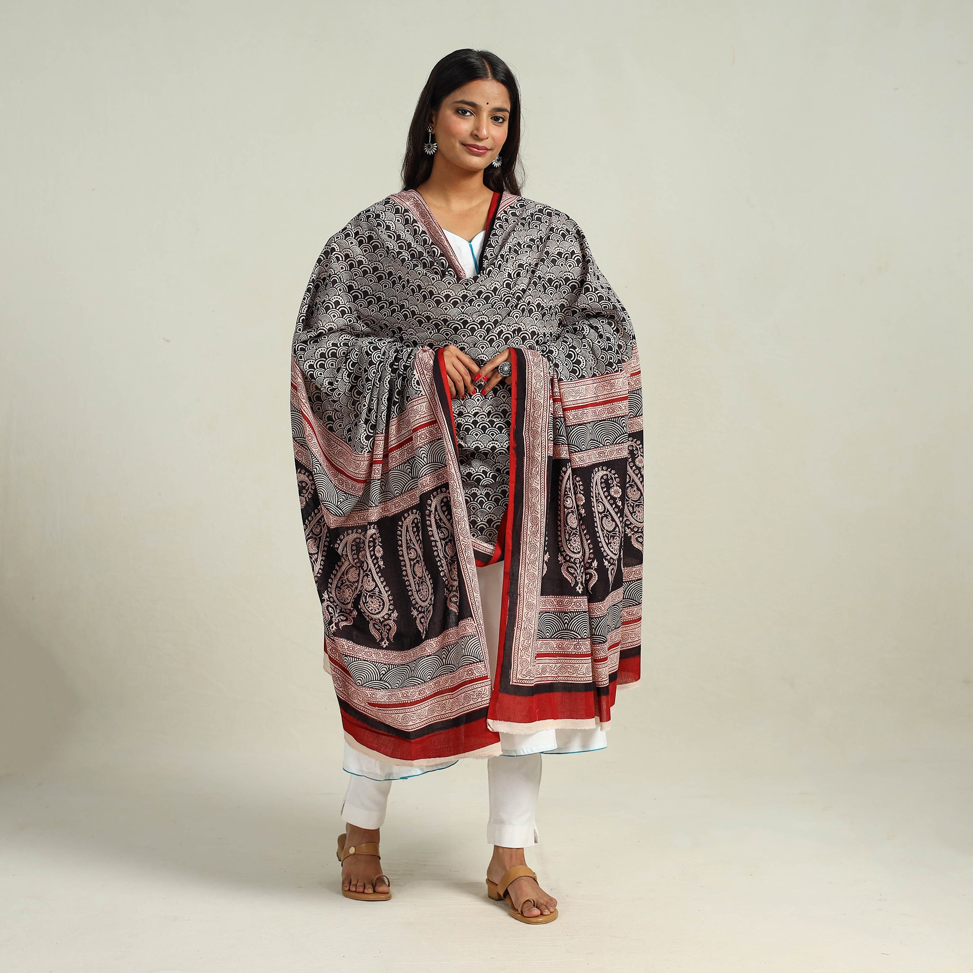 This black hand block printed cotton bagh dupatta, made using natural dyes through the process of hand block printing by artisans in Bagh, the Dhar district of Madhya Pradesh. Style it with your favorite outfits for a pop of cultural elegance.