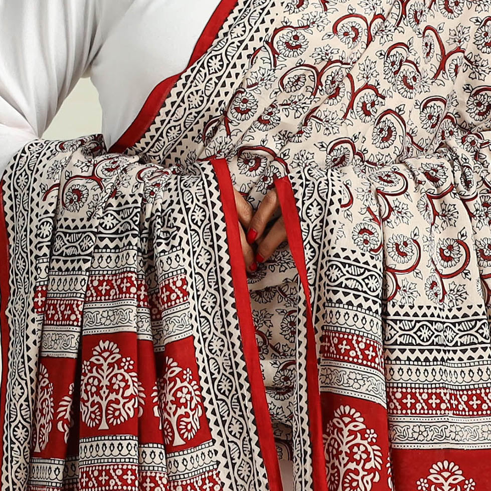 This beige hand block printed cotton bagh dupatta, made using natural dyes through the process of hand block printing by artisans in Bagh, the Dhar district of Madhya Pradesh. Style it with your favorite outfits for a pop of cultural elegance.