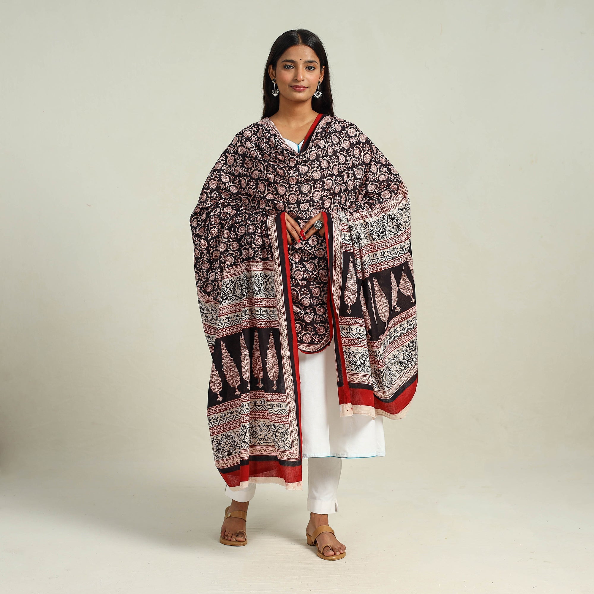 This black hand block printed cotton bagh dupatta, made using natural dyes through the process of hand block printing by artisans in Bagh, the Dhar district of Madhya Pradesh. Style it with your favorite outfits for a pop of cultural elegance.