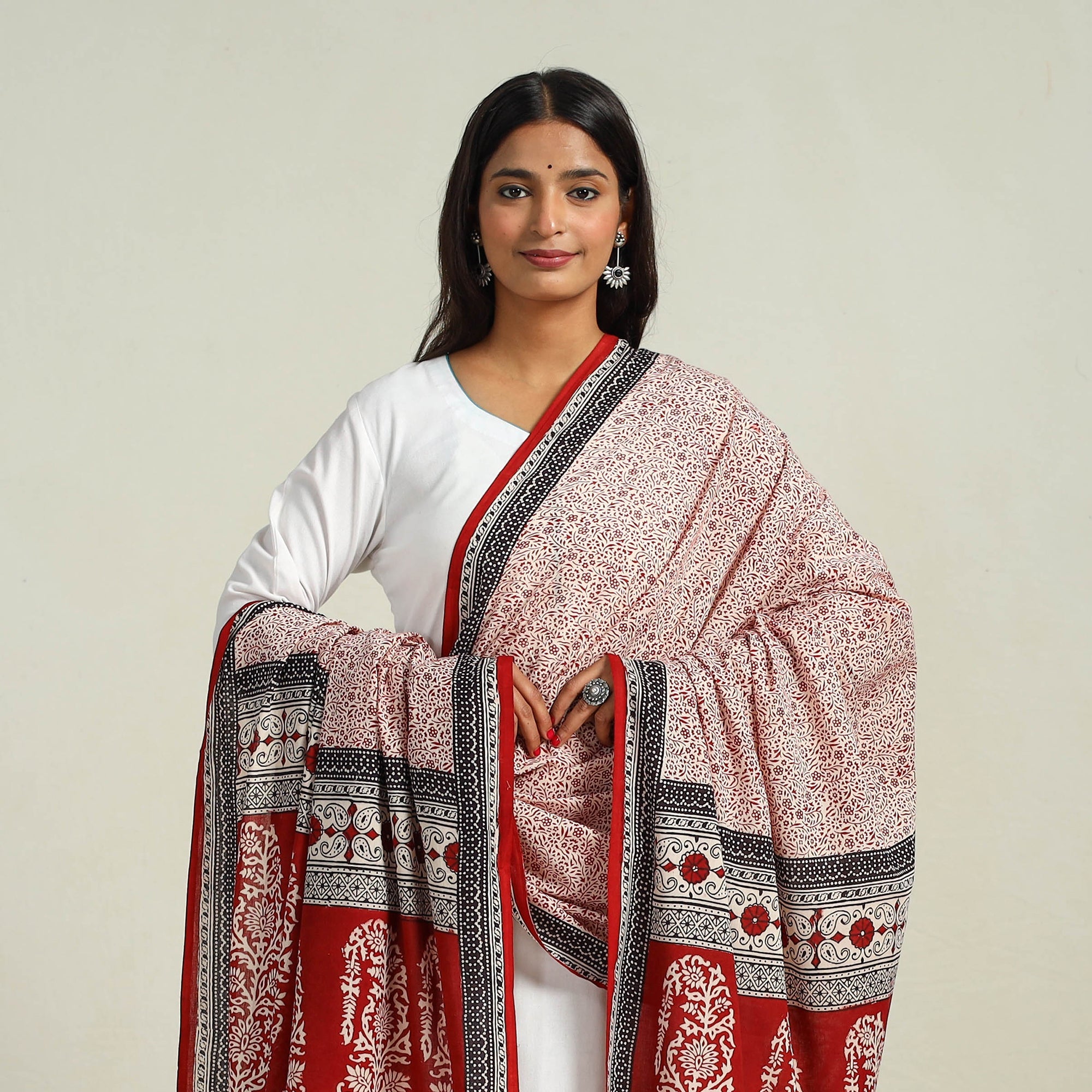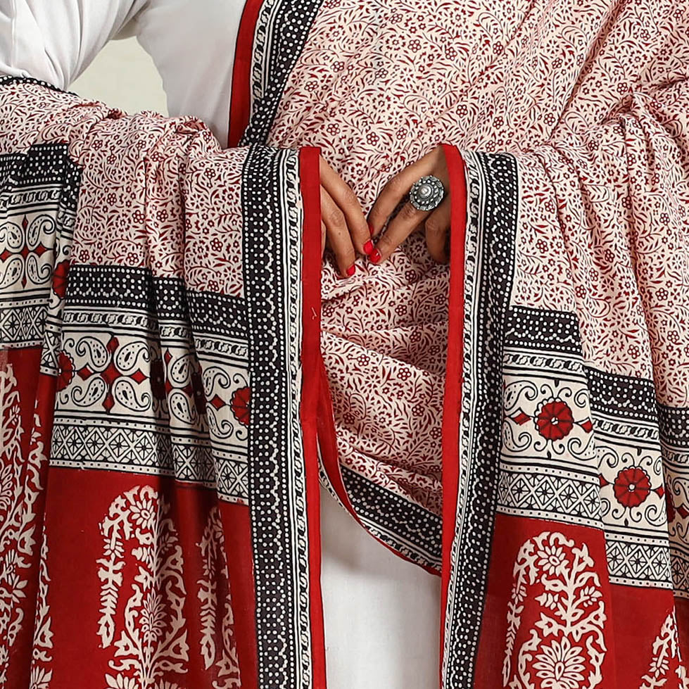 This red hand block printed cotton bagh dupatta, made using natural dyes through the process of hand block printing by artisans in Bagh, the Dhar district of Madhya Pradesh. Style it with your favorite outfits for a pop of cultural elegance.
