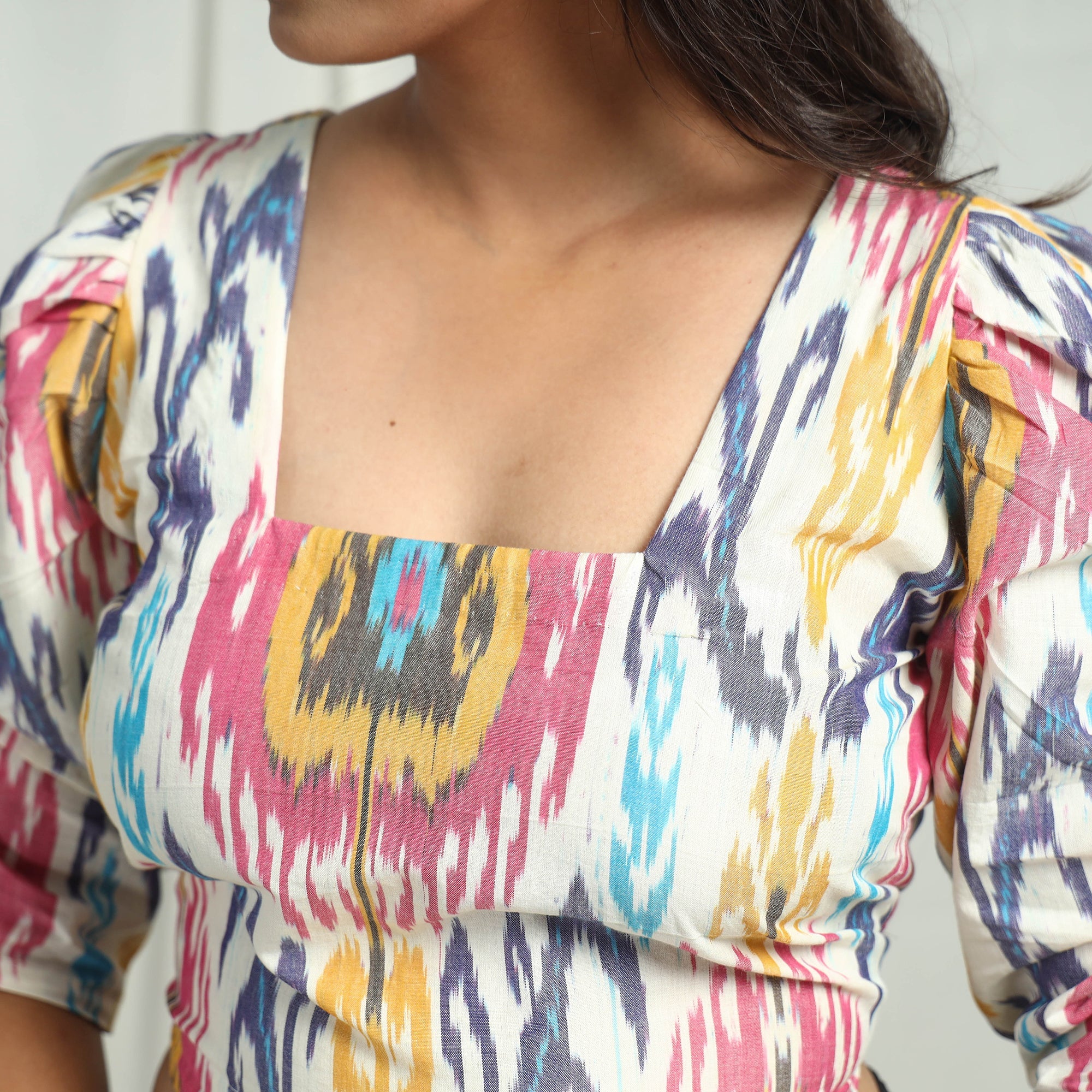 Elevate your wardrobe with our white cotton central asian pochampally ikat crop top, a beautiful blend of tradition and modern style. The unique pochampally ikat weave showcases the rich cultural heritage of India, making it a perfect choice for both daily outings and special occasions.