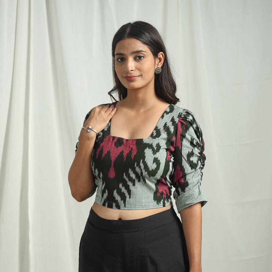 Elevate your wardrobe with our grey cotton central asian pochampally ikat crop top, a beautiful blend of tradition and modern style. The unique pochampally ikat weave showcases the rich cultural heritage of India, making it a perfect choice for both daily outings and special occasions.