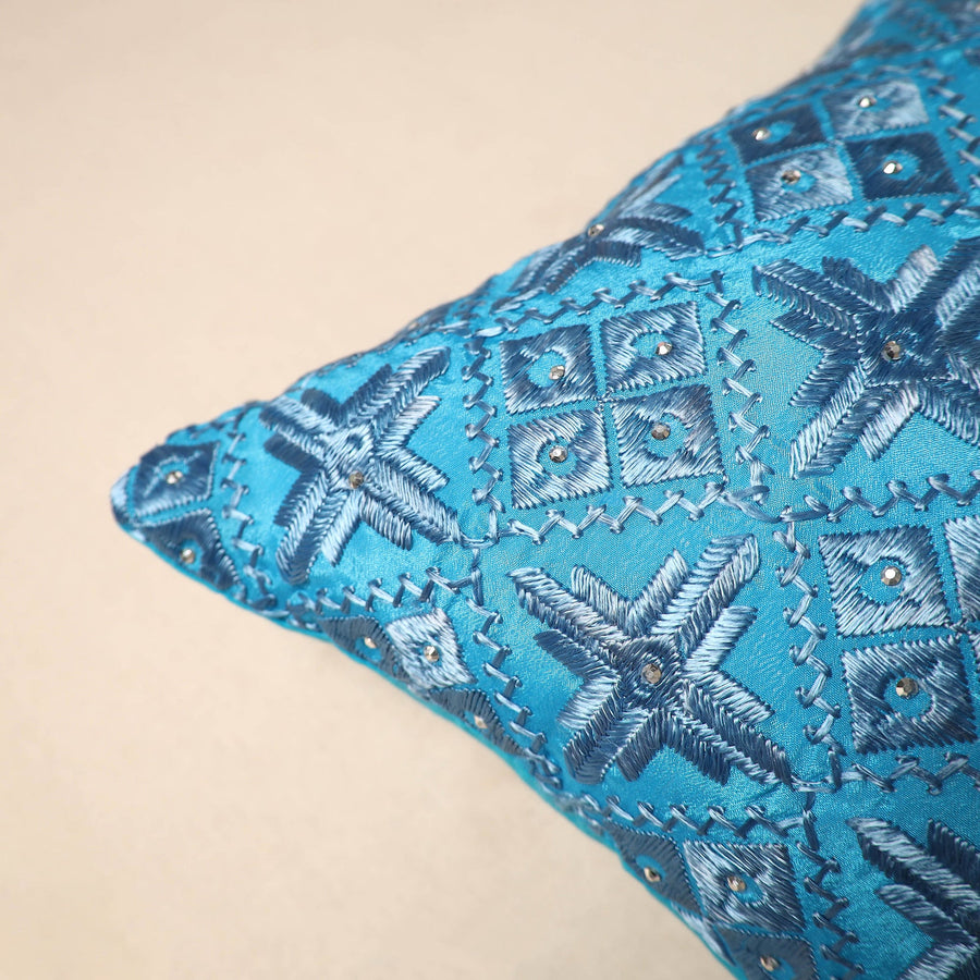 Add a touch to your home with this blue phulkari embroidery cushion cover. Crafted from chinon fabric with multicolor viscose silk threadwork, reflect the rich cultural heritage of Punjab. Phulkari, meaning "flower craft," is a traditional embroidery technique known for its designs. Perfect for adding a unique touch to your living area.