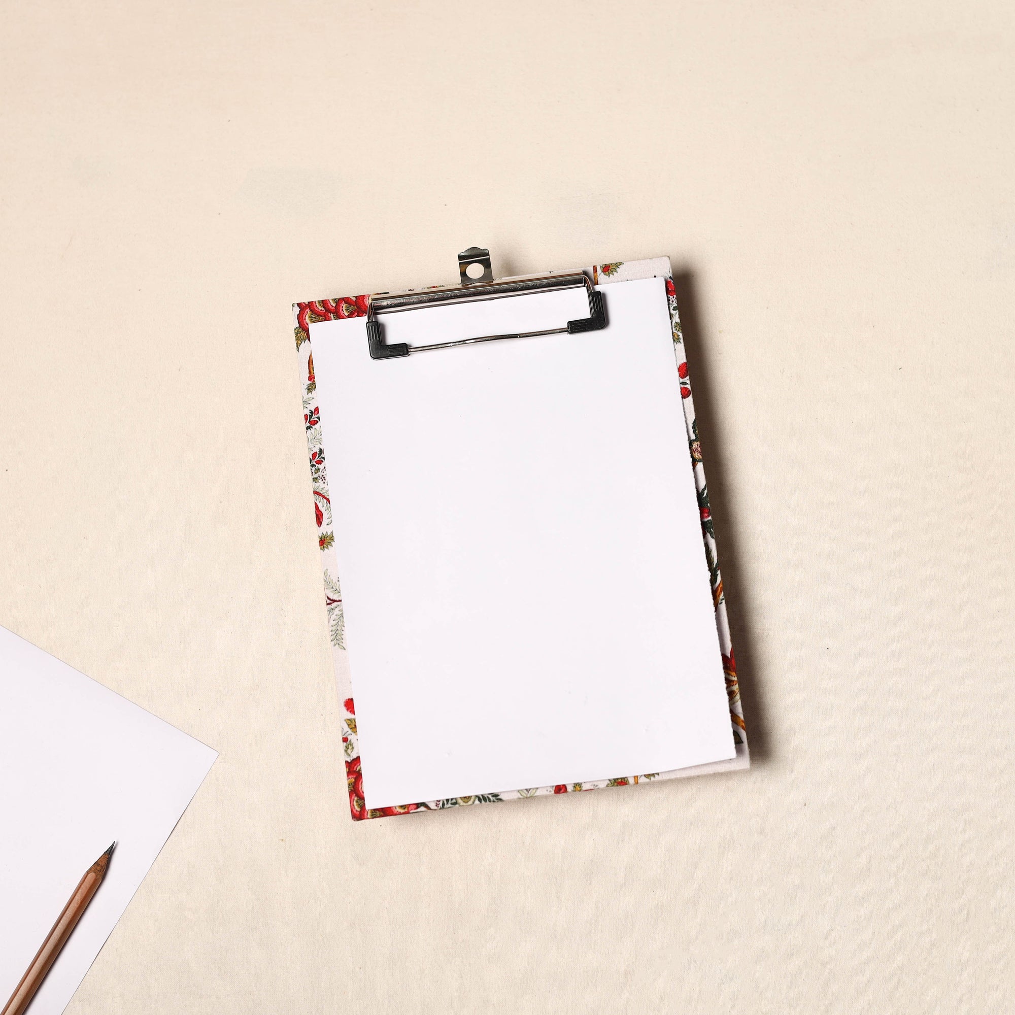 Material Enhance your workspace with our exquisite handcrafted floral-printed clipboard. Made from durable hardboard and adorned with vibrant screen-printed cotton fabric, this clipboard combines style and practicality. Perfect for note-taking, sketches, or organizing documents, it adds a sophisticated touch to your daily tasks.