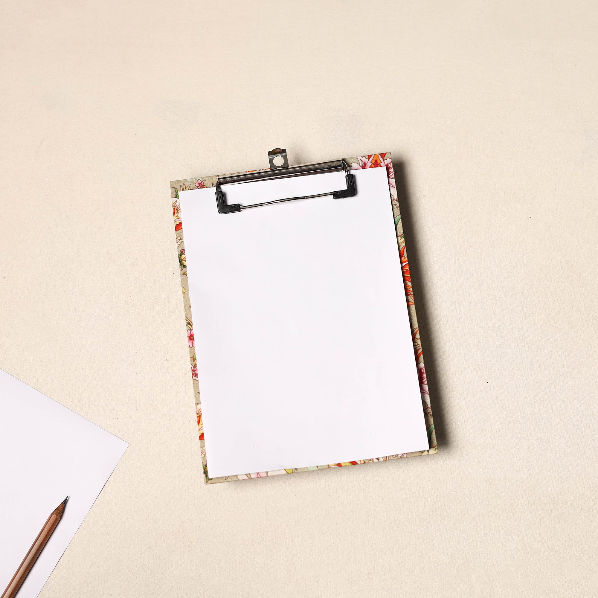 Enhance your workspace with our exquisite handcrafted floral-printed clipboard. Made from durable hardboard and adorned with vibrant screen-printed cotton fabric, this clipboard combines style and practicality. Perfect for note-taking, sketches, or organizing documents, it adds a sophisticated touch to your daily tasks.