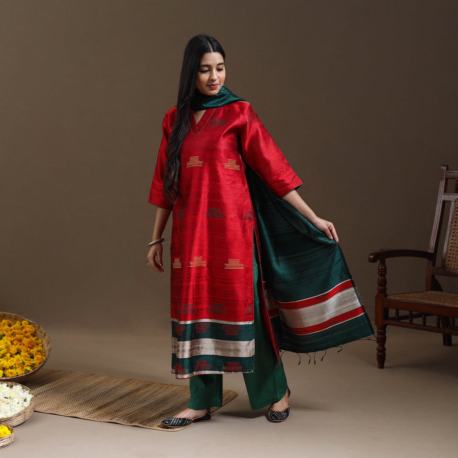 Indulge in the timeless elegance of red bhagalpuri tussar silk with this beautifully designed suit set. The tussar silk suit set combines the comfort of a cotton x viscose palazzo. Handwoven by artisans in Bhagalpur, this ensemble features a kurta with a handy one-side pocket and comfortable palazzo with an elastic waist and two pockets, blending luxury with functionality.