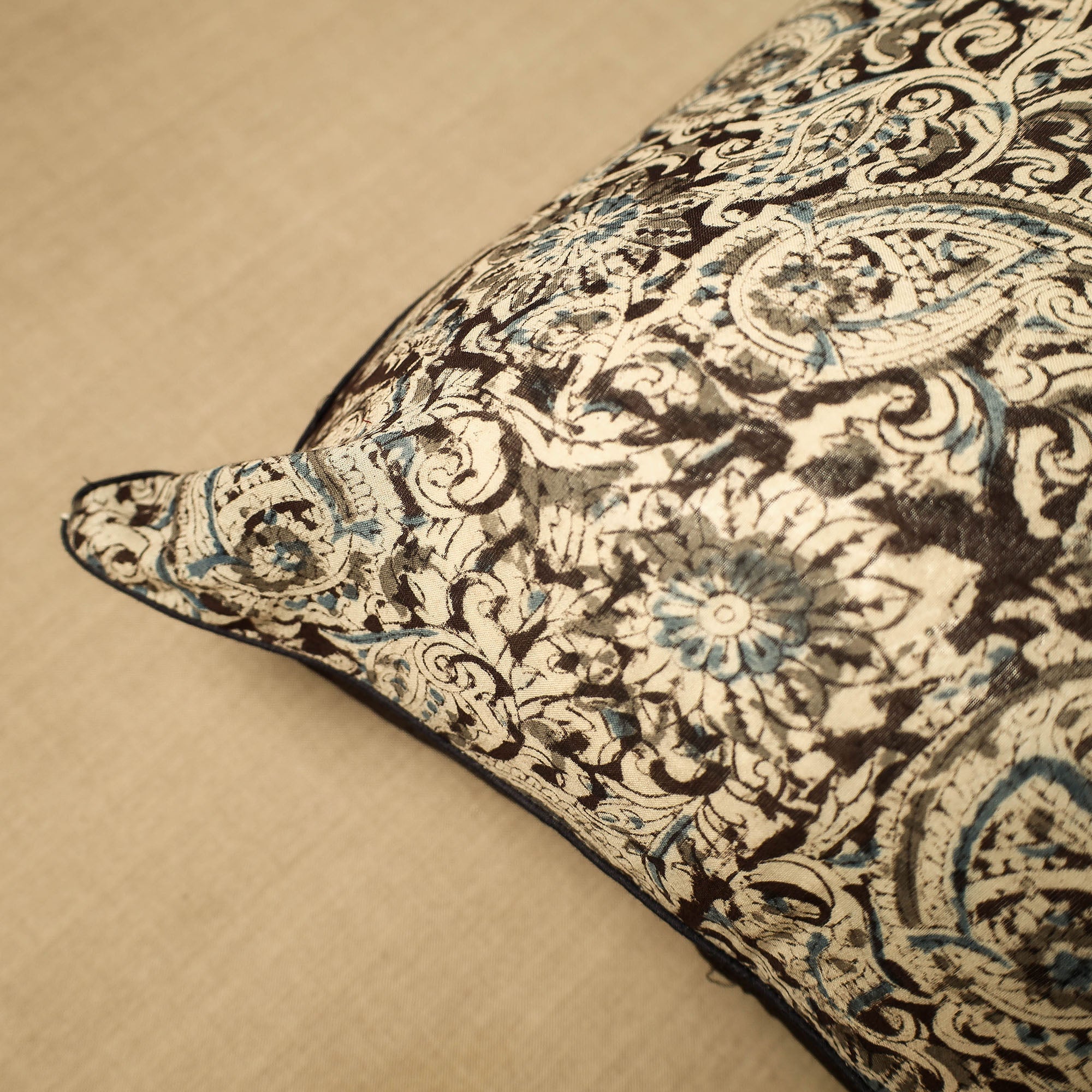 Elevate your home decor with our beige hand-block-printed cotton kalamakari cushion cover, a testament to traditional craftsmanship. Kalamkari is the earliest and more complex technique of block printing; this showcases intricate block-printed motifs on high-quality cotton.
