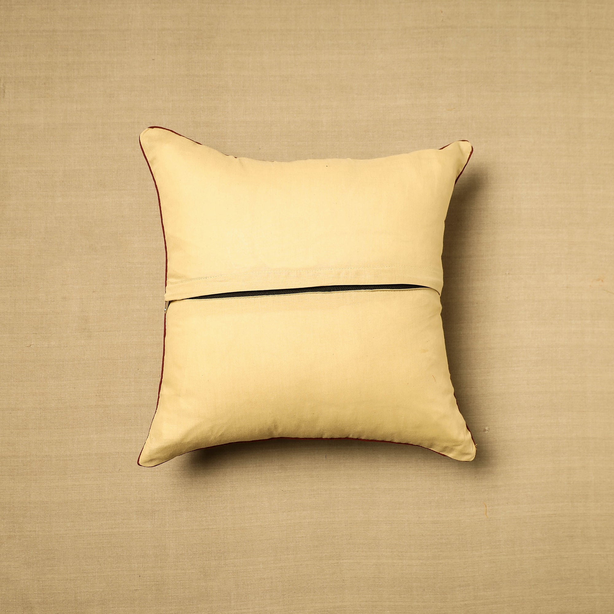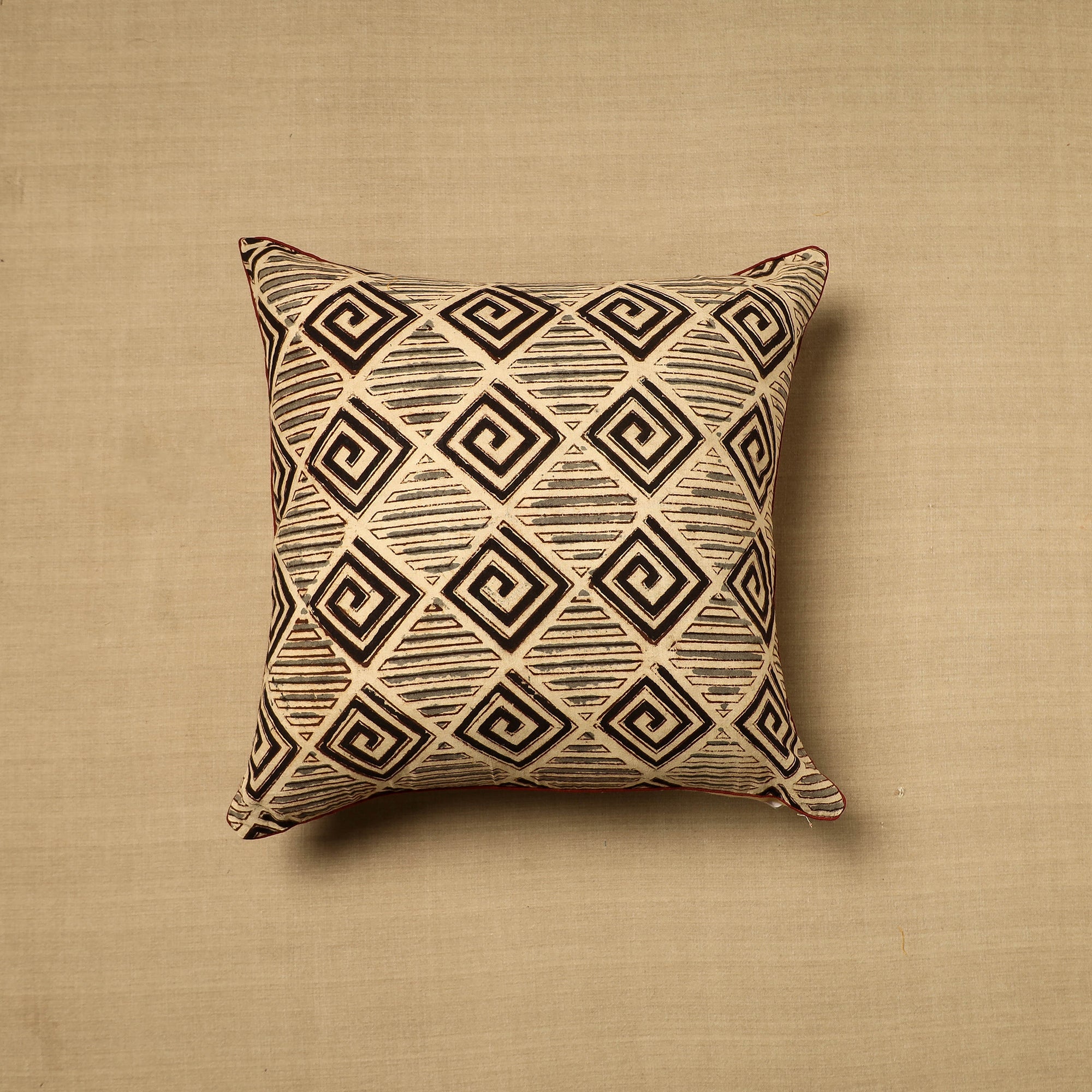 Elevate your home decor with our beige hand-block-printed cotton kalamakari cushion cover, a testament to traditional craftsmanship. Kalamkari is the earliest and more complex technique of block printing; this showcases intricate block-printed motifs on high-quality cotton.