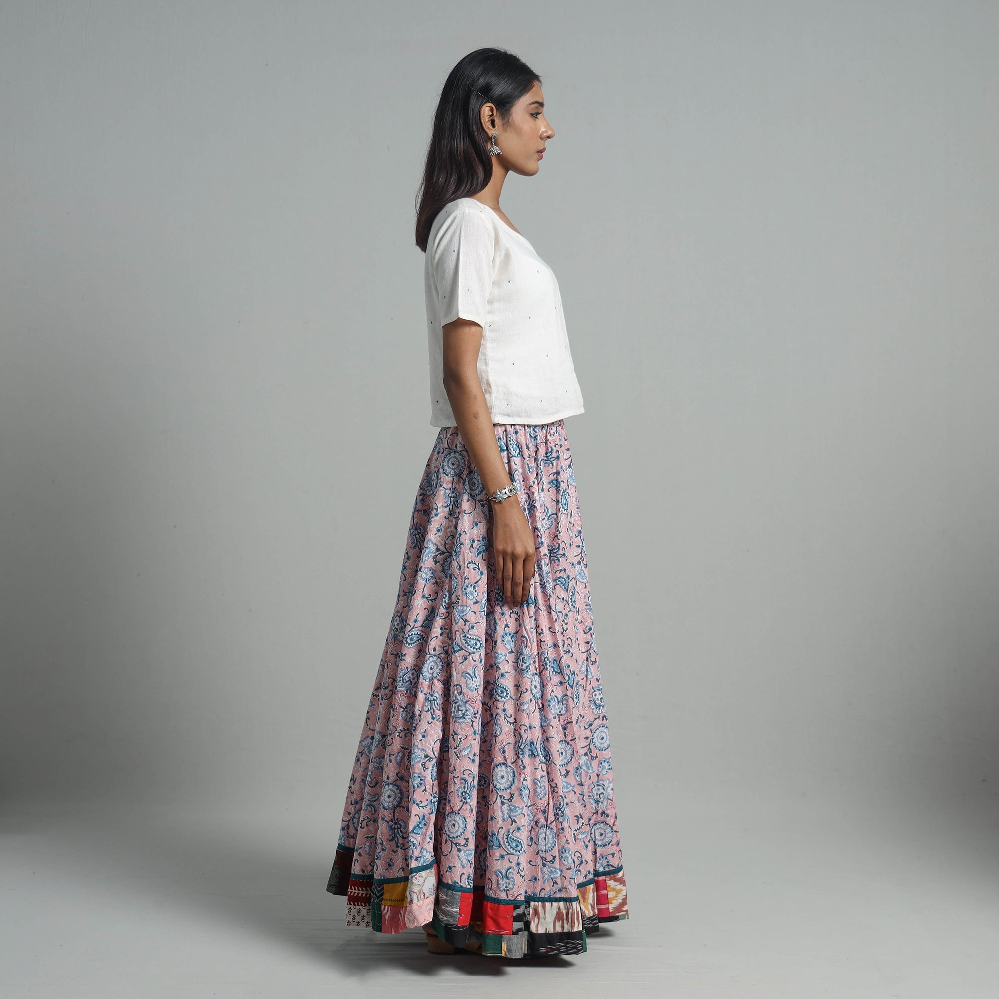 Step into timeless elegance with this pink sanganeri block-printed long skirt with patchwork border. Made from cotton, it features an elasticized waist that ensures comfort and traditional block printing from Sanganer, Jaipur. Known for its floral motifs, this adds a unique cultural touch to your wardrobe.
