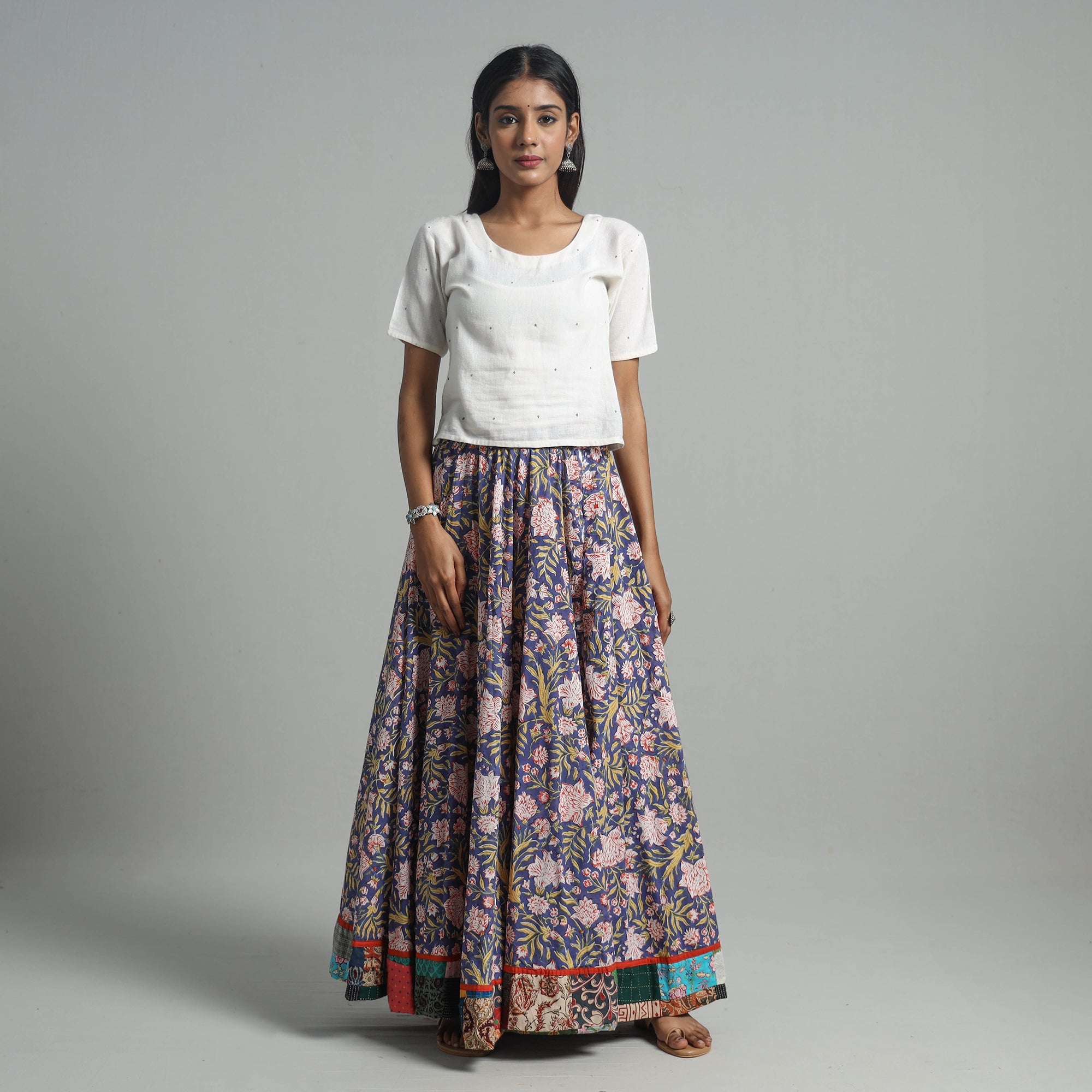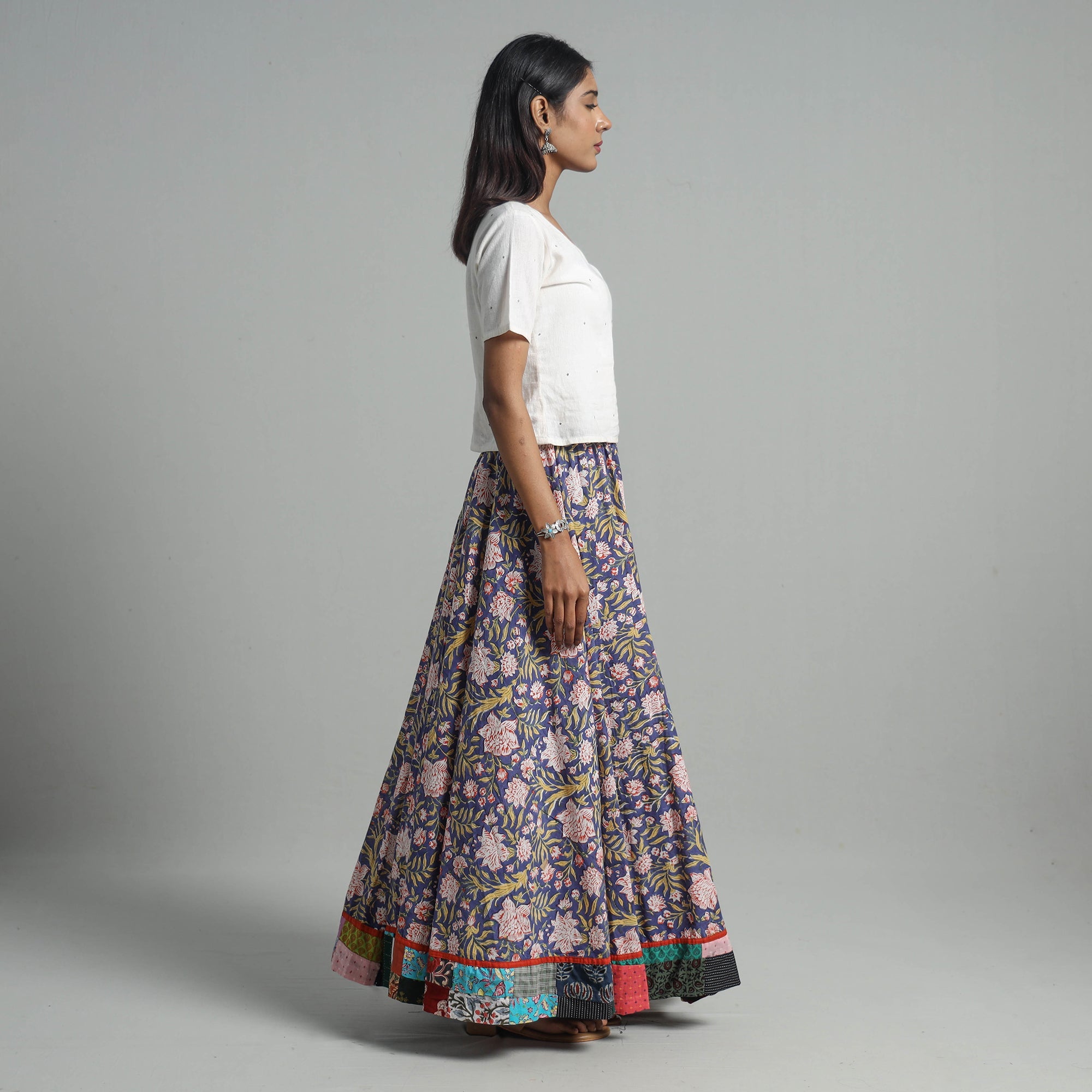 Step into timeless elegance with this sanganeri block-printed long skirt with patchwork border. Made from cotton, it features an elasticized waist that ensures comfort and traditional block printing from Sanganer, Jaipur. Known for its floral motifs, this adds a unique cultural touch to your wardrobe.
