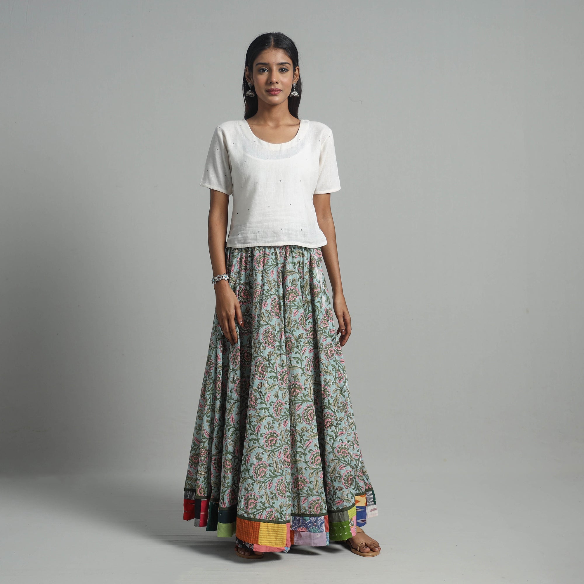 Step into timeless elegance with this green sanganeri block-printed long skirt with patchwork border. Made from cotton, it features an elasticized waist that ensures comfort and traditional block printing from Sanganer, Jaipur. Known for its floral motifs, this adds a unique cultural touch to your wardrobe.