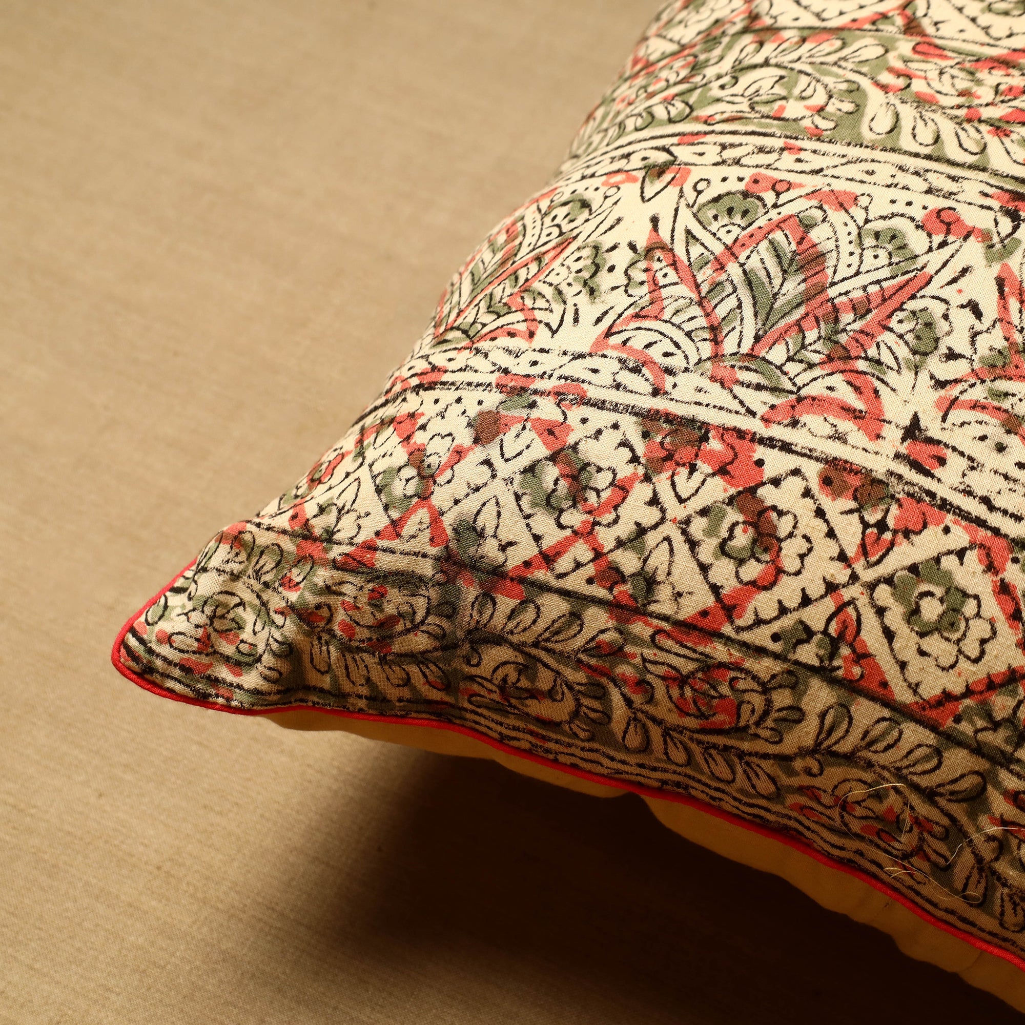 Elevate your home decor with our beige hand-block-printed cotton kalamakari cushion cover, a testament to traditional craftsmanship. Kalamkari is the earliest and more complex technique of block printing; this showcases intricate block-printed motifs on high-quality cotton.