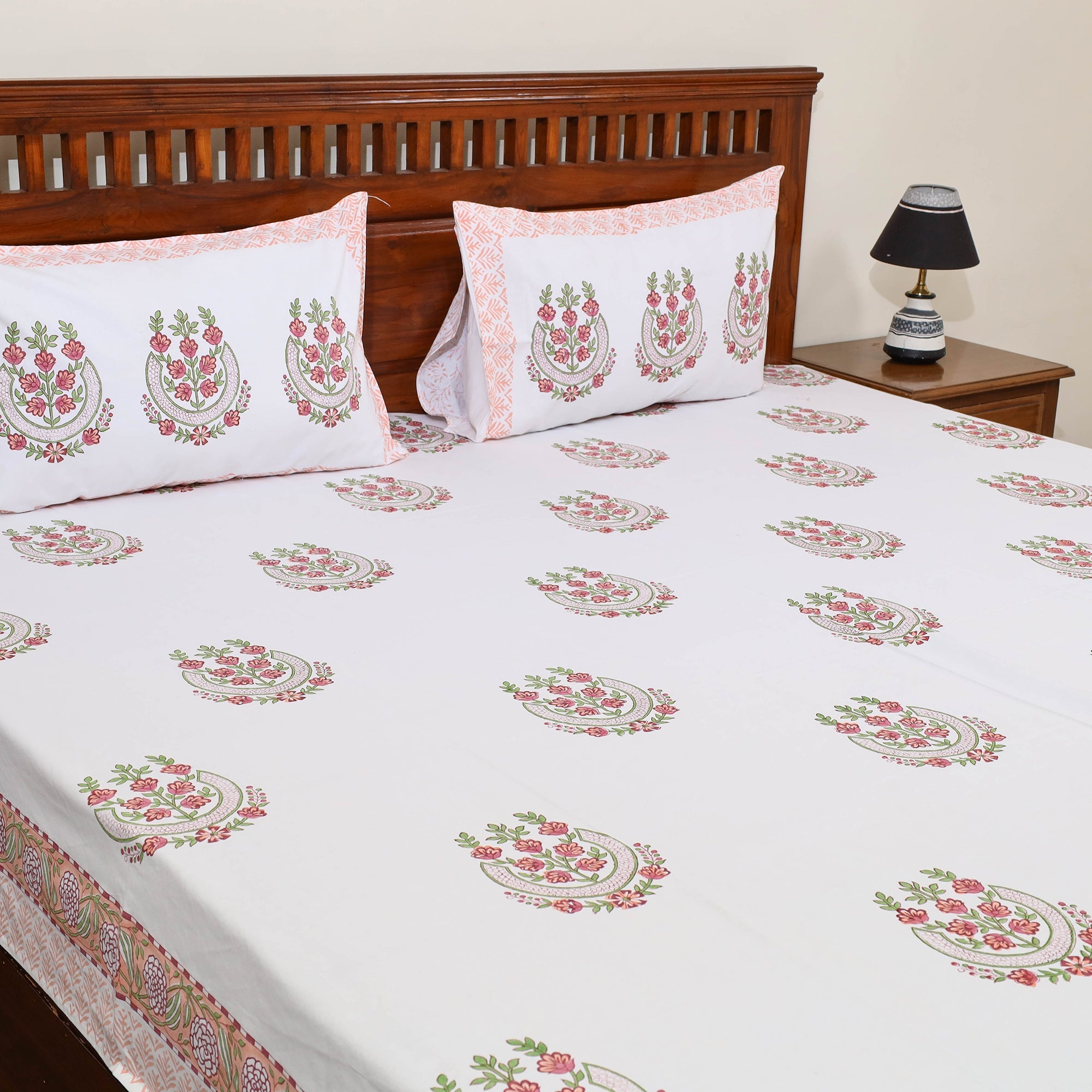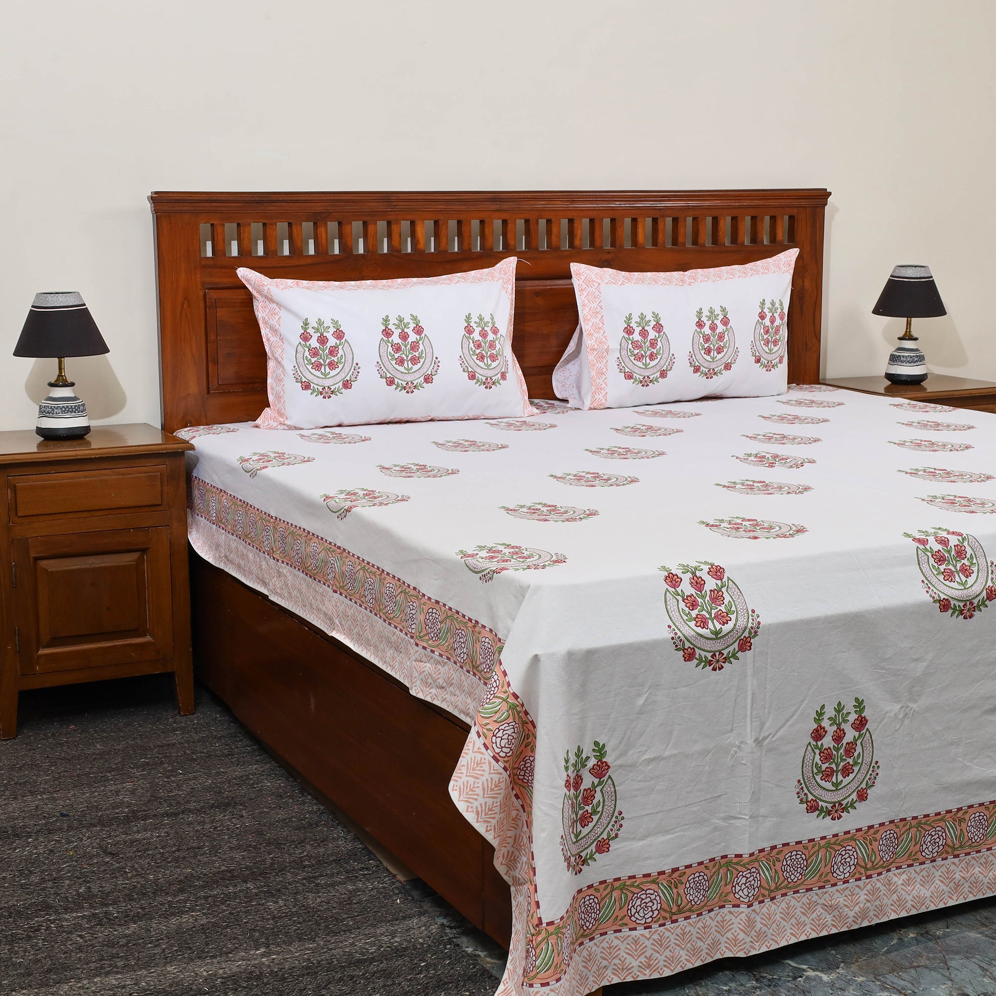 Elevate your bedroom decor with this sanganeri print bed sheet. Handcrafted by skilled artisans using traditional block printing techniques from Rajasthan. it showcases intricate designs and vibrant colors that add a touch of elegance to your bedroom. Made from cotton and dyed using bleed-free VAT dyes, it ensures durability and long-lasting beauty. Its double size comes with matching pillow covers, making it a complete set.