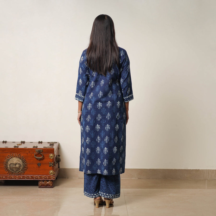 Feel the beauty of traditional craftsmanship with this indigo bagru print kurta set. Featuring a comfortable cotton kurta with a side pocket, palazzo with two side pockets, and a dupatta, this suit set is perfect for daily wear or special occasions. Hand-block printed using natural dyes, the intricate patterns showcase the heritage of Rajasthan.