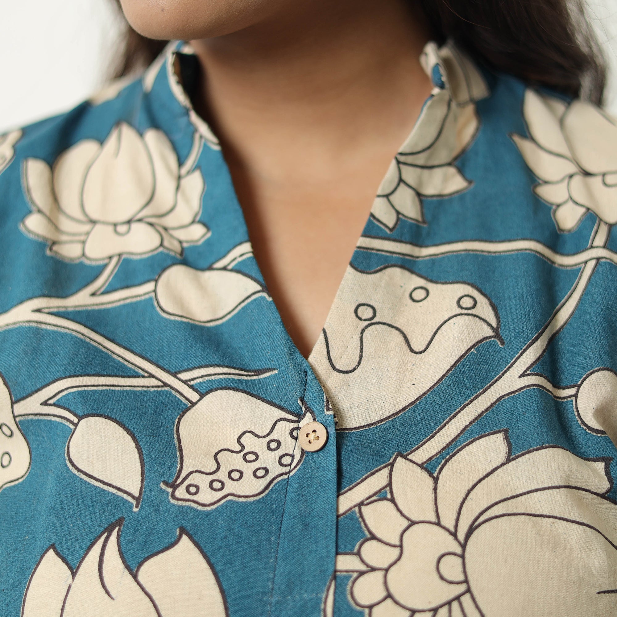 This straight cotton Kalamkari kurta reflects India’s traditional artistry, handcrafted by artisans using techniques. The cotton fabric ensures comfort throughout the day, while the Kalamkari print adds a touch of cultural elegance. With a side pocket for convenience, it’s perfect for both casual and festive occasions.