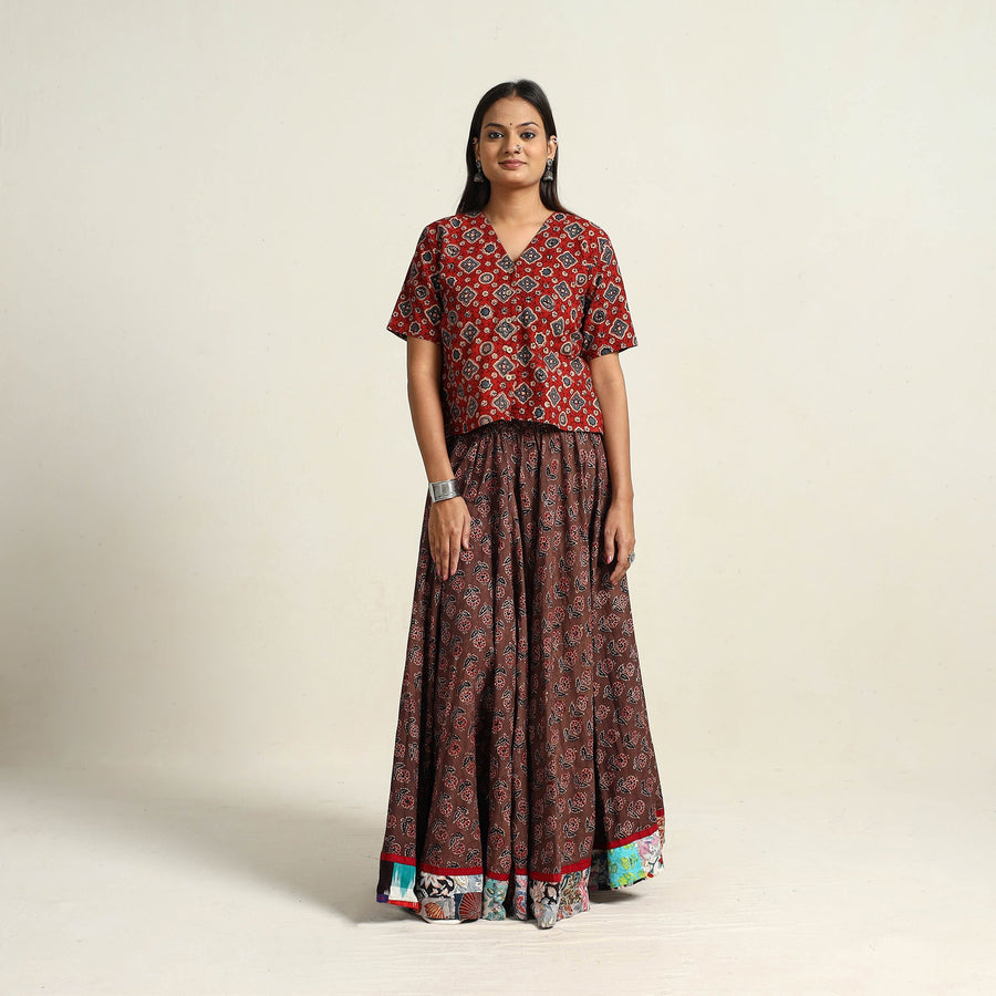 Embrace the beauty of traditional brown ajrakh block printing with our hand block print long skirt. Made from cotton, this skirt brings the artistry of Gujarat and Rajasthan to life. Perfect for adding cultural flair to your wardrobe, this skirt supports local artisans.