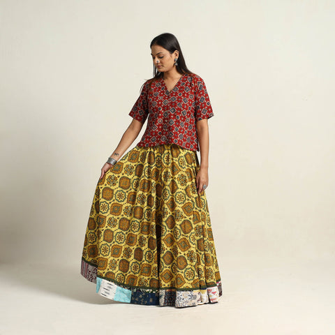 Embrace the beauty of traditional yellow ajrakh block printing with our hand block print long skirt. Made from cotton, this skirt brings the artistry of Gujarat and Rajasthan to life. Perfect for adding cultural flair to your wardrobe, this skirt supports local artisans.
