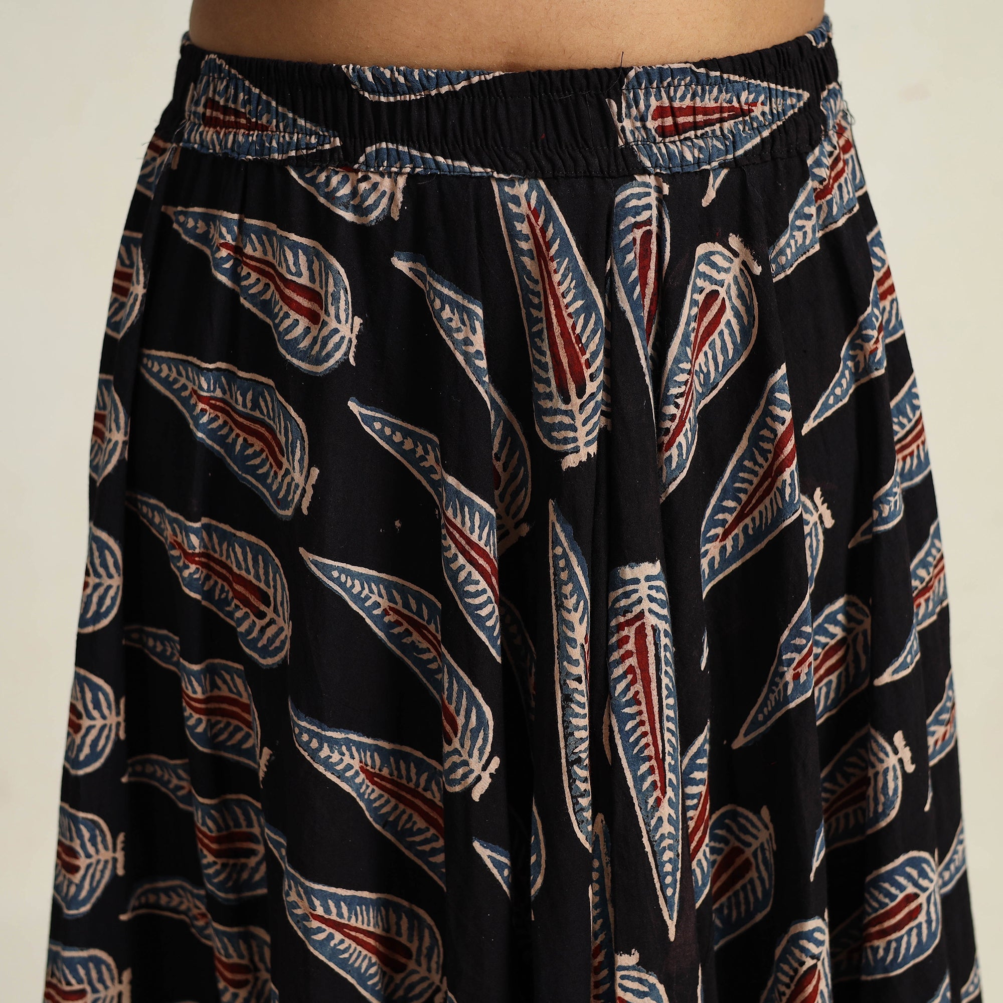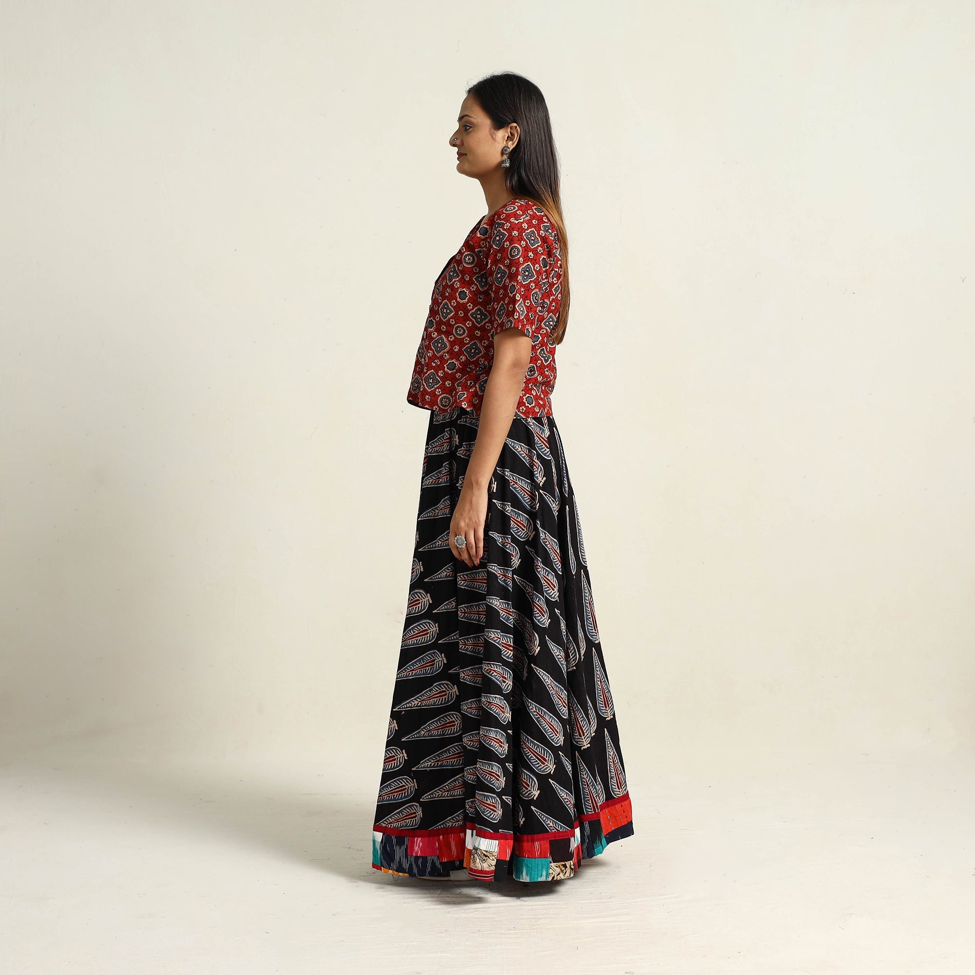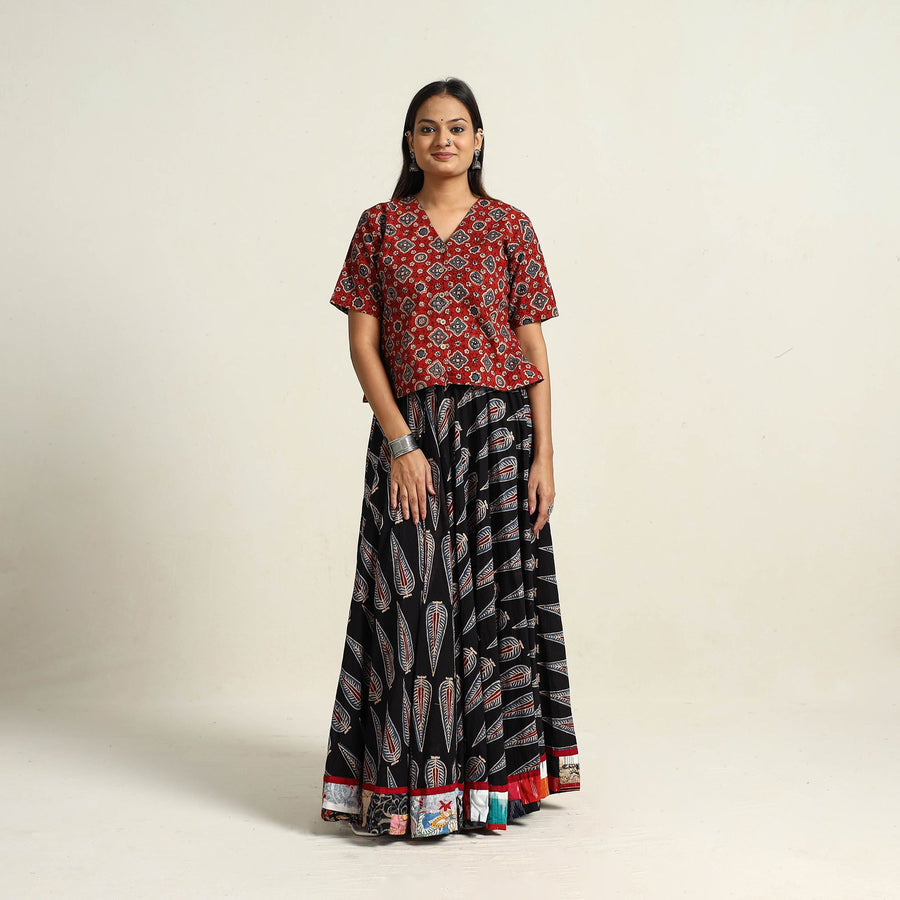 Embrace the beauty of traditional black ajrakh block printing with our hand block print long skirt. Made from cotton, this skirt brings the artistry of Gujarat and Rajasthan to life. Perfect for adding cultural flair to your wardrobe, this skirt supports local artisans.