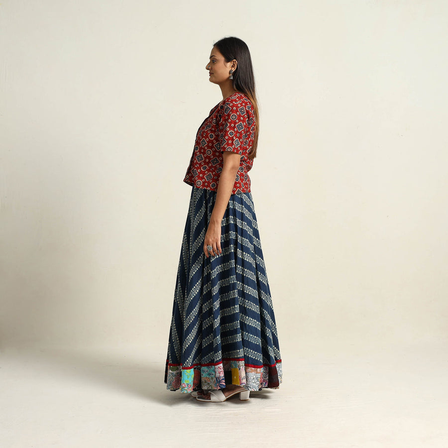 Embrace the beauty of traditional blue ajrakh block printing with our hand block print long skirt. Made from cotton, this skirt brings the artistry of Gujarat and Rajasthan to life. Perfect for adding cultural flair to your wardrobe, this skirt supports local artisans.