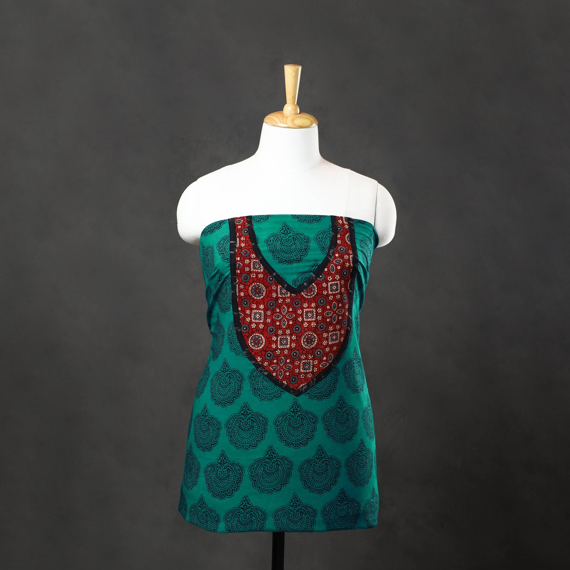 Embrace the rich tradition this green bagh print cotton kurta material with patchwork, crafted by skilled artisans from Bagh, Madhya Pradesh. This fabric features intricate block-print that reflect India's cultural heritage. Known for its bold colors and detailed prints, making it an ideal choice for those who value both tradition and sustainability.