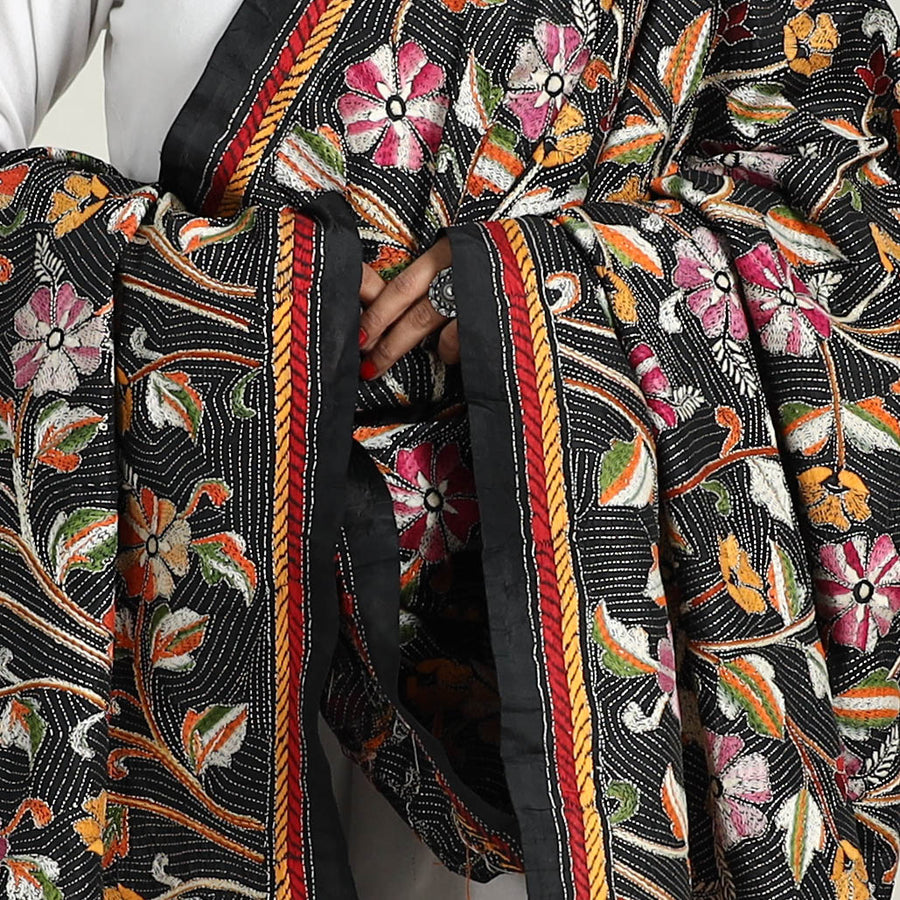 Embrace the timeless beauty of this pure silk bengal kantha dupatta. Made by skilled artisan Takdira Begum from Bolpur, each piece tells a story of tradition, culture, and impeccable craftsmanship. The intricate Kantha embroidery adds charm, while the silk offers lightweight and comfort. Perfect for both casual and formal occasions, this dupatta brings a touch of heritage to your wardrobe.