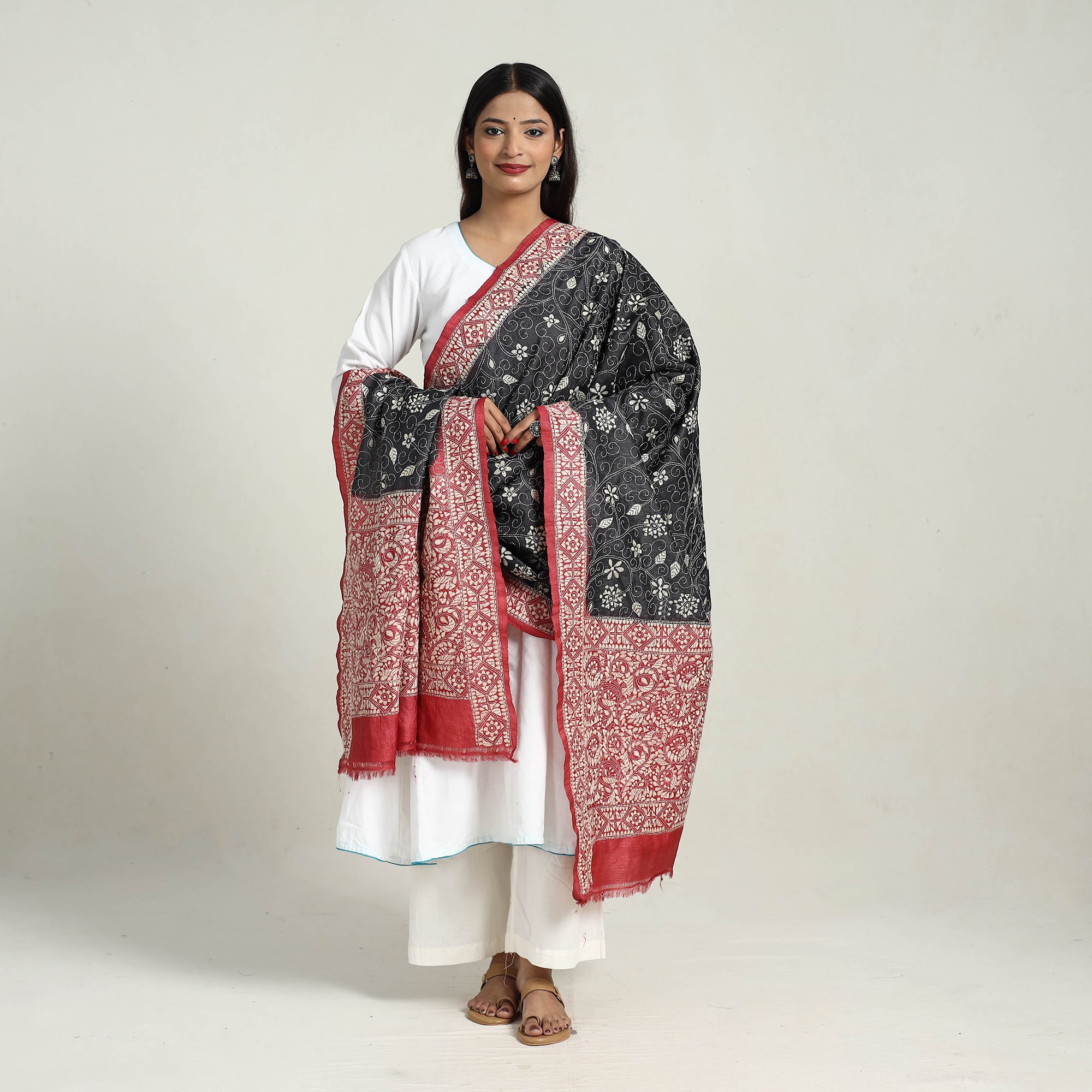 Embrace the timeless beauty of this handloom tussar silk bengal kantha dupatta. Made by skilled artisan Takdira Begum from Bolpur, each piece tells a story of tradition, culture, and impeccable craftsmanship. The intricate Kantha embroidery adds charm, while the tussar silk offers a luxurious blend of sheen and comfort. Perfect for both casual and formal occasions, this dupatta brings a touch of heritage to your wardrobe.