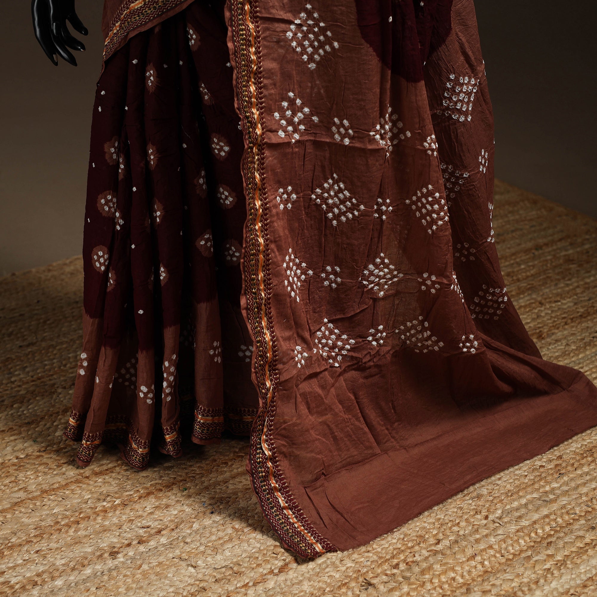 The art of maroon bandhani with this kutch cotton saree, hand-tie and dyed by skilled artisans. This beautiful saree showcases the traditional Bandhani technique resulting in vibrant patterns. Made with cotton, it's lightweight perfect for any occasion.