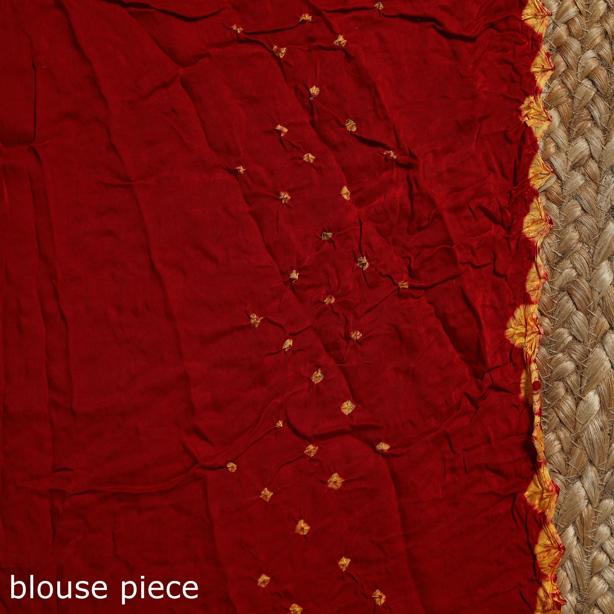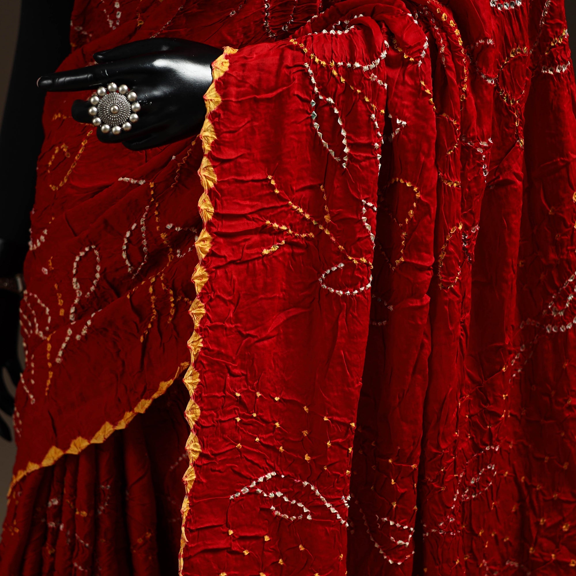 The art of red bandhani with this kutch modal silk saree, hand-tie and dyed by skilled artisans.This saree features vibrant patterns and a luxurious zari border. Ideal for festive occasions, this piece reflects the timeless art of bandhani. Embrace cultural heritage with sustainable fashion.
